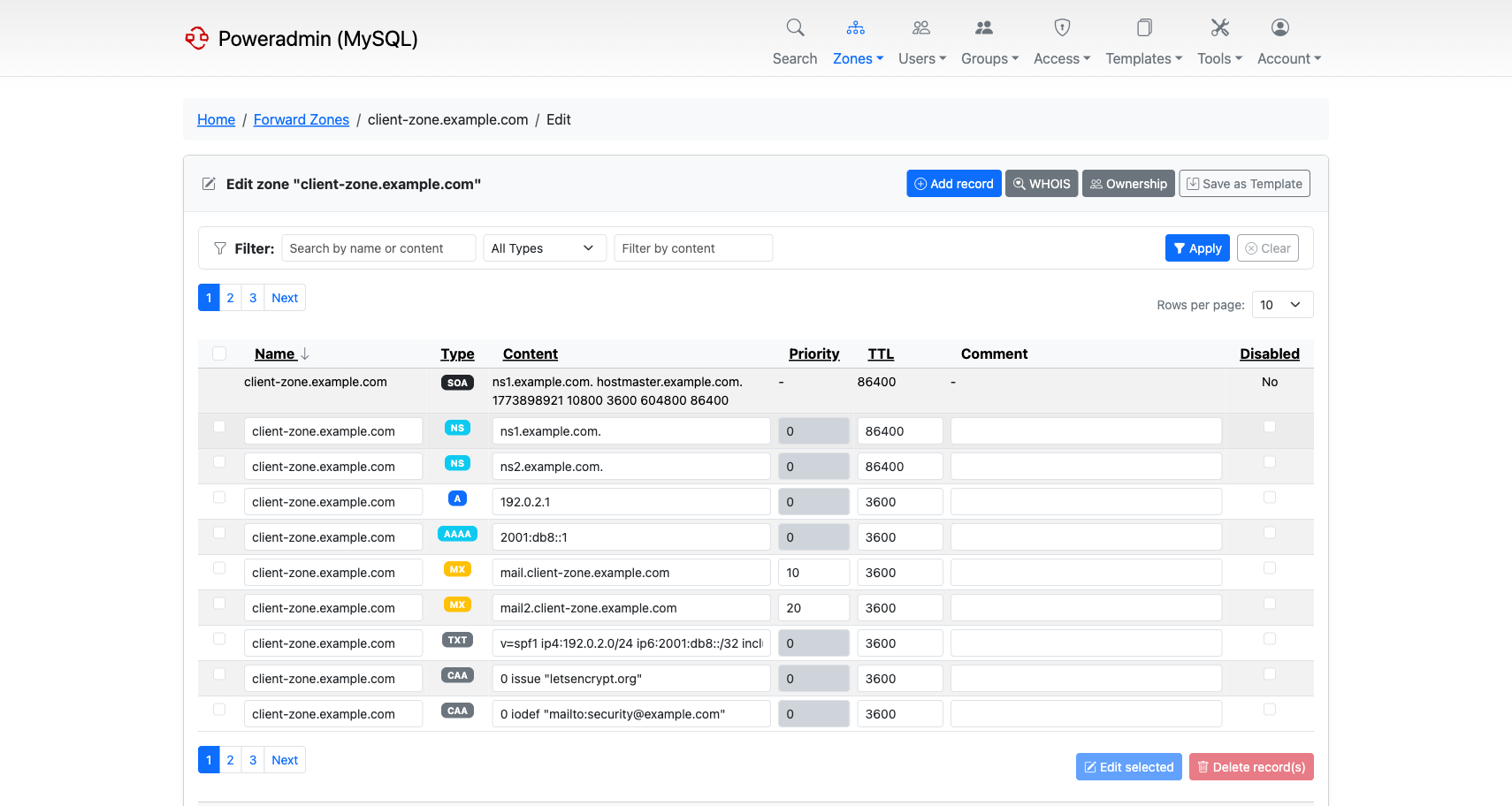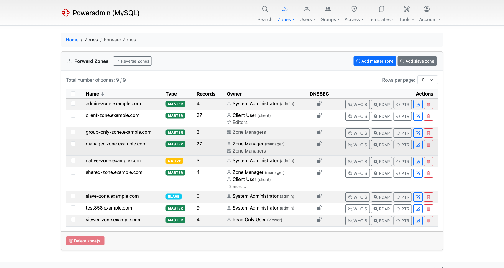 Poweradmin is a friendly web-based DNS administration tool for PowerDNS server. The interface supports most of the features of PowerDNS. It is a hybrid solution that uses SQL for most operations and has PowerDNS API support for DNSSEC operations.