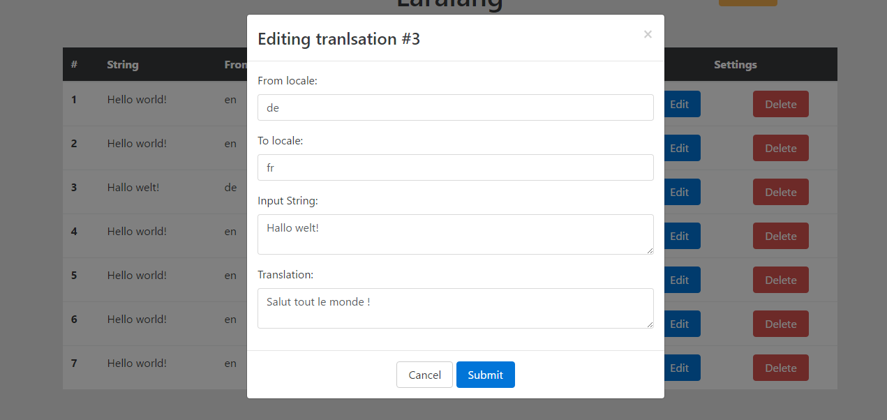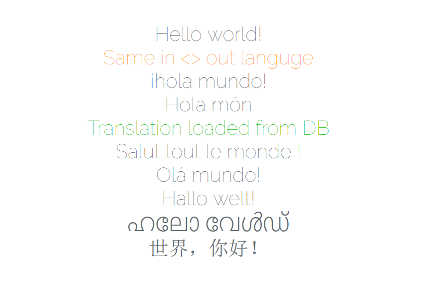 {!! Laralang::trans('Hallo welt!')->setFrom('de')->setTo('fr') !!}