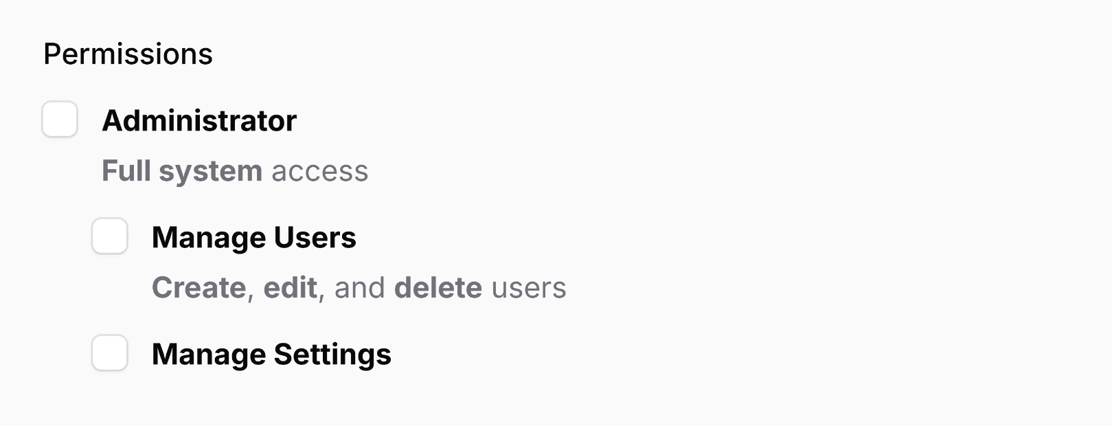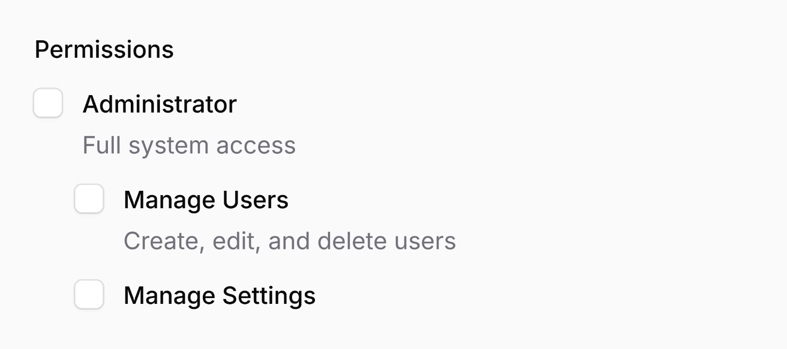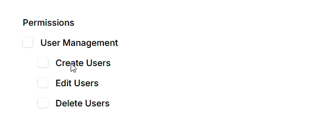 CheckboxTree::make('permissions') ->options([ 'admin' => [ 'label' => 'Administrator', 'description' => 'Full system access', 'children' => [ 'manage_users' => [ 'label' => 'Manage Users', 'description' => 'Create, edit, and delete users', ], 'manage_settings' => 'Manage Settings', ], ], ])