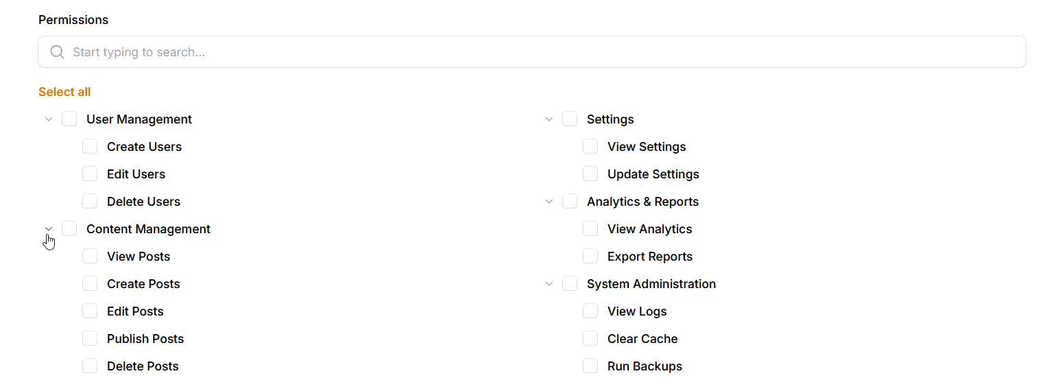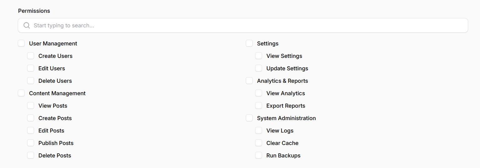 CheckboxTree::make('permissions') ->searchable() ->searchPrompt('Search permissions...') ->options([...])