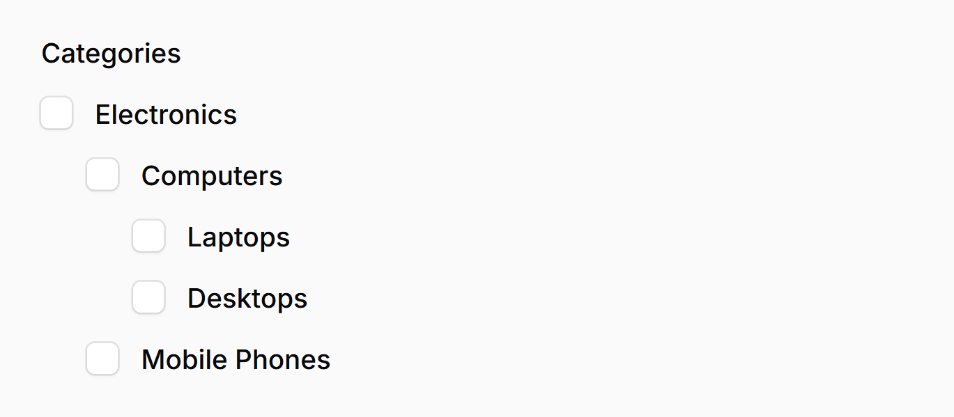 CheckboxTree::make('categories') ->options([ 'electronics' => [ 'label' => 'Electronics', 'children' => [ 'computers' => [ 'label' => 'Computers', 'children' => [ 'laptops' => 'Laptops', 'desktops' => 'Desktops', ], ], 'phones' => 'Mobile Phones', ], ], ])