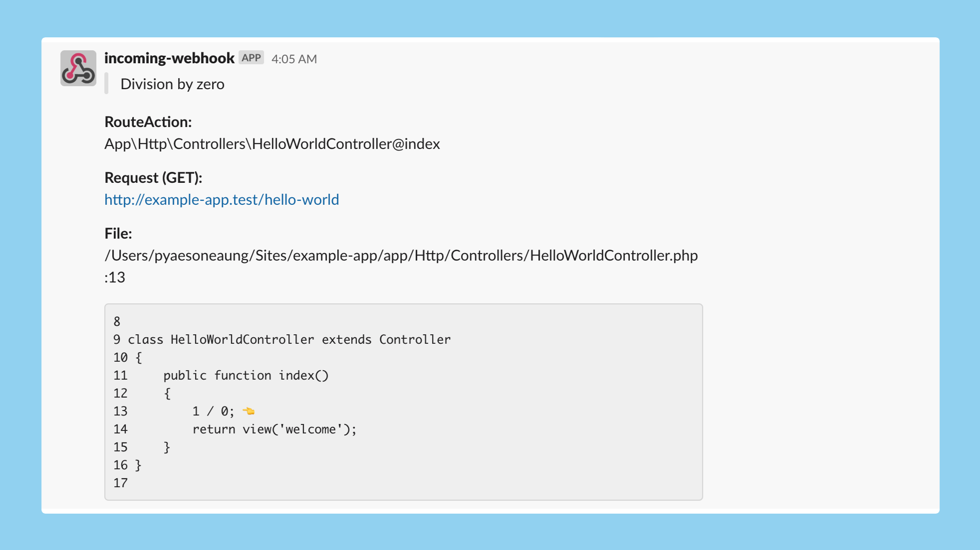 Notify Laravel errors to Slack with a clean UI and include a code snippet.
