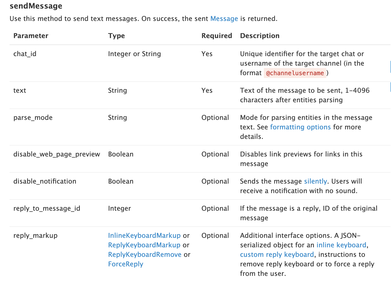 Let's give an example you wanted to send a message,We look at the required parameters from BotAPI.