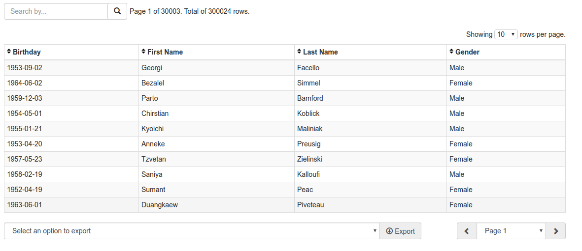 $Grid->fields([ 'birth_date'=>'Birthday', 'first_name'=>'First Name', 'last_name'=>'Last Name', 'gender'=>[ 'label'=>'Gender', 'field'=>"case when gender = 'M' then 'Male' else 'Female' end" ] ]) ->actionFields([ 'emp_no' //The fields used for process actions. those not are showed ]) ->advancedSearch([ 'birth_date'=>['type'=>'date','label'=>'Birthday'], 'first_name'=>'First Name', // It's a shortcut for ['type'=>'text', 'label'=>'First Name'], 'last_name'=>[ //omiting the label. I'ts a shortcut, like above 'type'=>'text', 'sanitize'=>false //This field will not be sanitized ], 'gender'=>[ 'type'=>'select', 'label'=>'Gender', 'options'=>['Male'=>'Male', 'Female'=>'Female'] //The key is the value of option ] ]); $Grid->action('Edit', 'test/edit/{emp_no}') ->action('Delete', 'test/{emp_no}', [ 'confirm'=>'Do you with so continue?', 'method'=>'DELETE', ]); $Grid->checkbox(true, 'emp_no'); $Grid->bulkAction('Delete selected itens', '/test/bulk-delete');