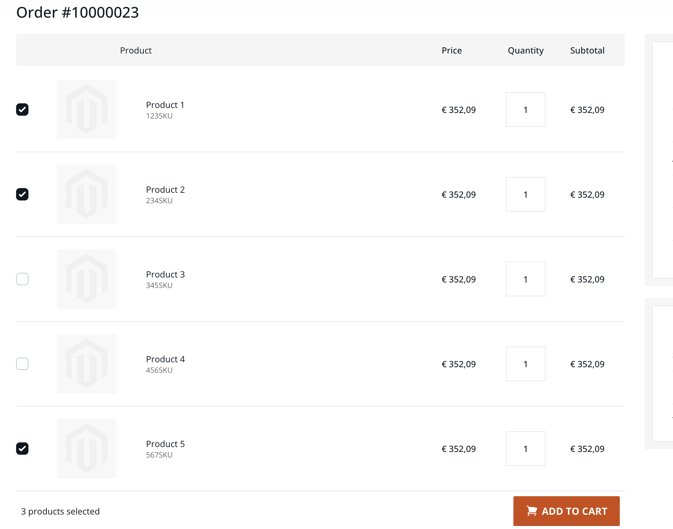 x-rapidez-reorder::reorderablecomponent around your products table with av-bind:itemscontaining your items. If you're not using the standard magento order data, ideally the items should be in the same format as OrderItem in the GraphQL API, or in the same format as CartItemInput (in this case you should add thecart-itemsprop). If you can't or won't add theentered_optionsandselected_options, any configurable items will be grayed out. -