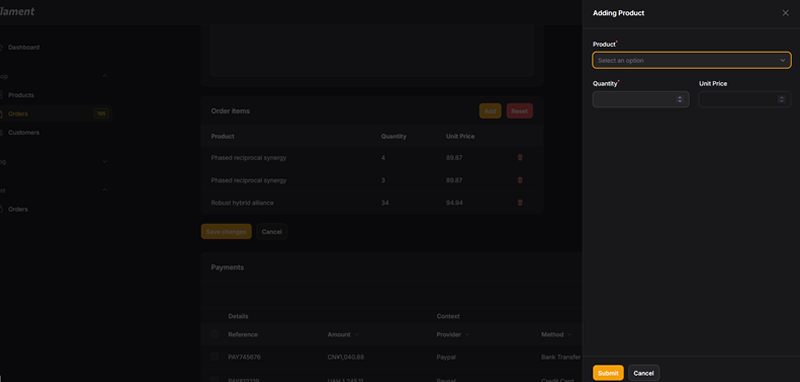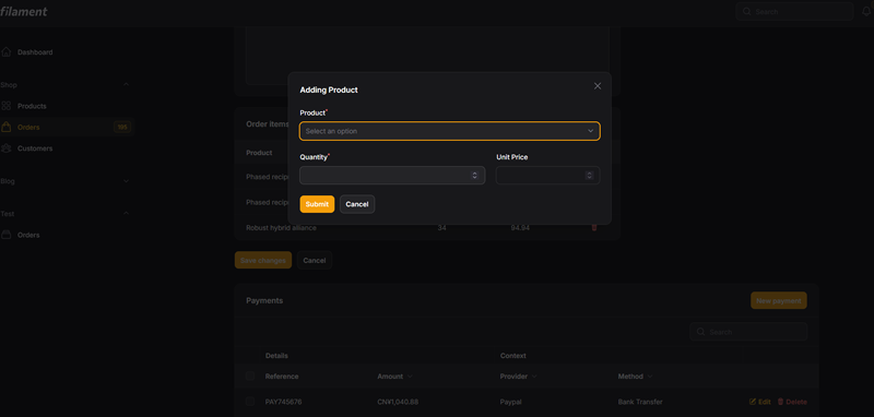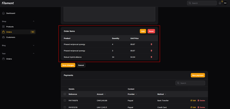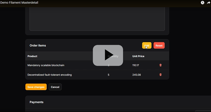 use Rodrigofs\FilamentMasterDetail\Forms\Components\MasterDetail; use Rodrigofs\FilamentMasterDetail\Tables\Columns\DataColumn; MasterDetail::make('items') ->relationship() ->schema([ Select::make('shop_product_id') ->label('Product') ->options(Product::query()->pluck('name', 'id')) ->required() ->reactive() ->afterStateUpdated(fn ($state, Set $set) => $set('price', Product::find($state)?->price ?? 0)) ->distinct() ->disableOptionsWhenSelectedInSiblingRepeaterItems() ->columnSpan(['md' => 5]) ->searchable(), TextInput::make('quantity') ->label('Quantity') ->numeric() ->default(1) ->required() ->columnSpan(['md' => 2]), TextInput::make('price') ->label('Unit Price') ->numeric() ->disabled() ->dehydrated() ->required() ->columnSpan(['md' => 3]), ]) ->unique('shop_product_id') ->table([ DataColumn::make('product.name') ->relationship() ->label('Product'), DataColumn::make('quantity') ->label('Quantity'), DataColumn::make('price') ->label('Unit Price'), DataColumn::make('total') ->formatStateUsing(fn ($rowLoop) => $rowLoop->price * $rowLoop->quantity) ->label('Total'), ]);