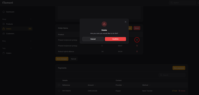 use Rodrigofs\FilamentMasterDetail\Forms\Components\MasterDetail; MasterDetail::make('items') ->relationship() ->schema([ Select::make('product_id') ->label('Product') ->options(Product::query()->pluck('name', 'id')) ->required(), TextInput::make('quantity') ->numeric() ->required(), ]) ->table([ DataColumn::make('product.name') ->relationship() ->label('Product'), DataColumn::make('quantity') ->label('Quantity'), ]) ->addActionLabel('Add Product') ->modalHeading('Add Product') ->modalDescription('Include a new product in this order.') ->modalIcon('heroicon-o-plus') ->modalWidth('lg') ->modalSubmitActionLabel('Add') ->modalCancelActionLabel('Cancel') ->heading('Order Items') ->formExceptClear(['product_id']) ->beforeAddActionExecute(fn ($state, $set) => $set('product_id', $state)) ->headerActions([ Action::make('reset') ->modalHeading('Are you sure?') ->modalDescription('All existing items will be removed from the order.') ->requiresConfirmation() ->color('danger') ->action(fn (Forms\Set $set) => $set('items', [])), ]) ->slideOver();