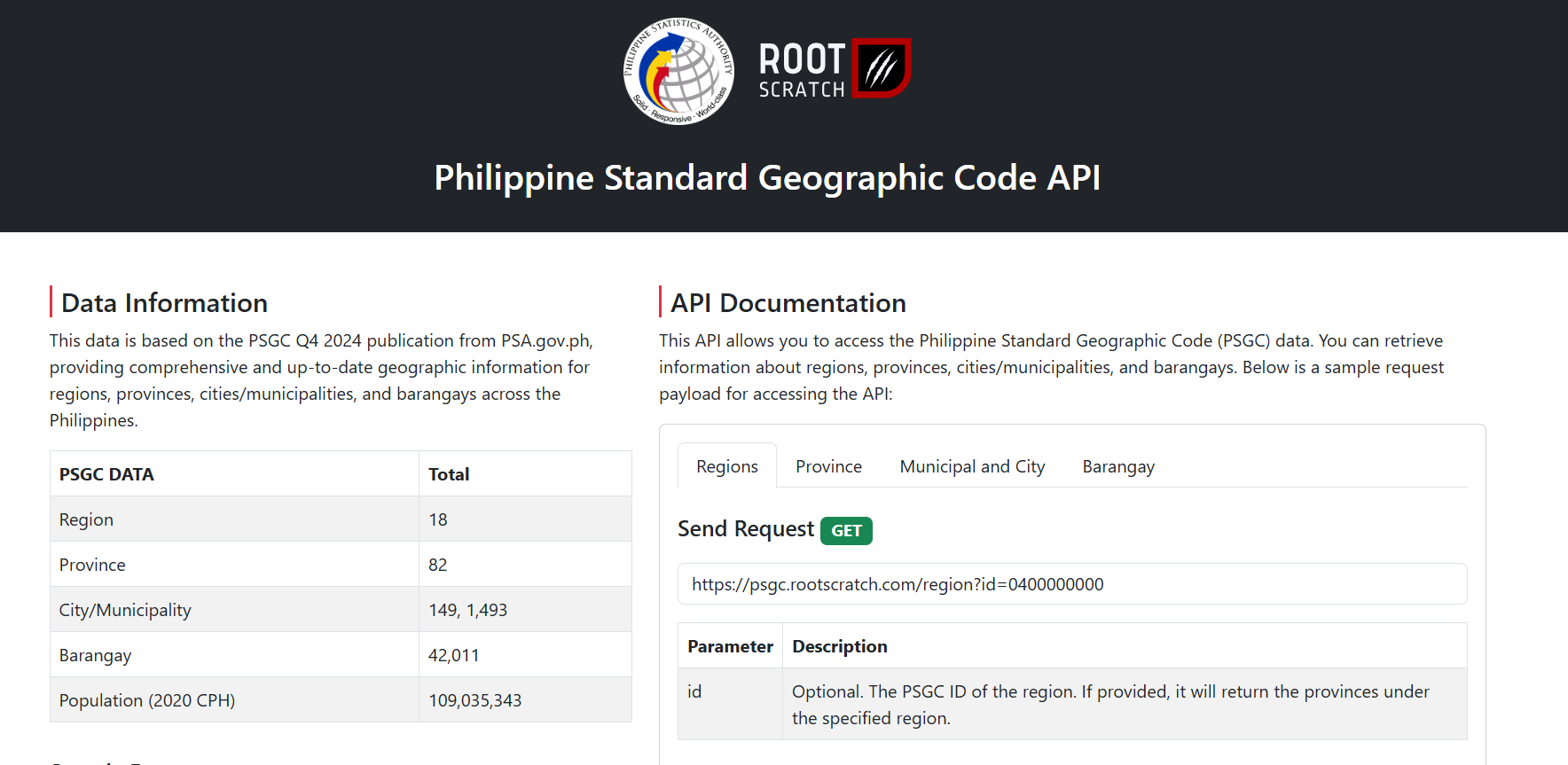 The PSGC-API provides access to the Philippine Standard Geographic Code (PSGC) data. This API allows users to retrieve information about regions, provinces, cities, municipalities, and barangays in the Philippines.