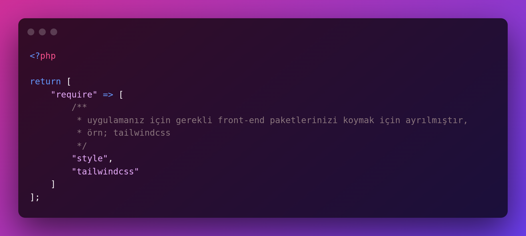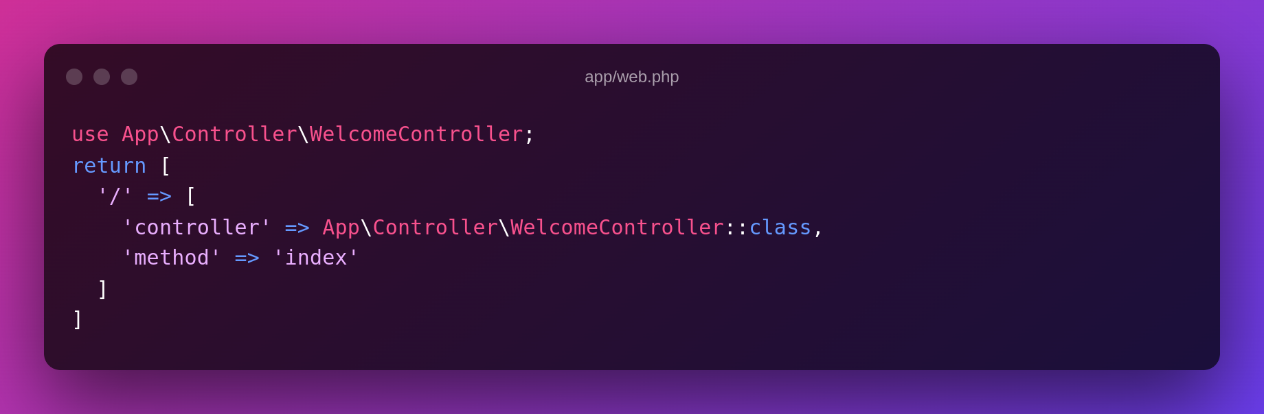 Aslında web.php geriye bir array döndürüyor, döndürülen array içerisinde ilk değerimiz bizim endpointimiz, ilk endpointin içerisinde olan iki değer ise bizim controller ve methodumuz.