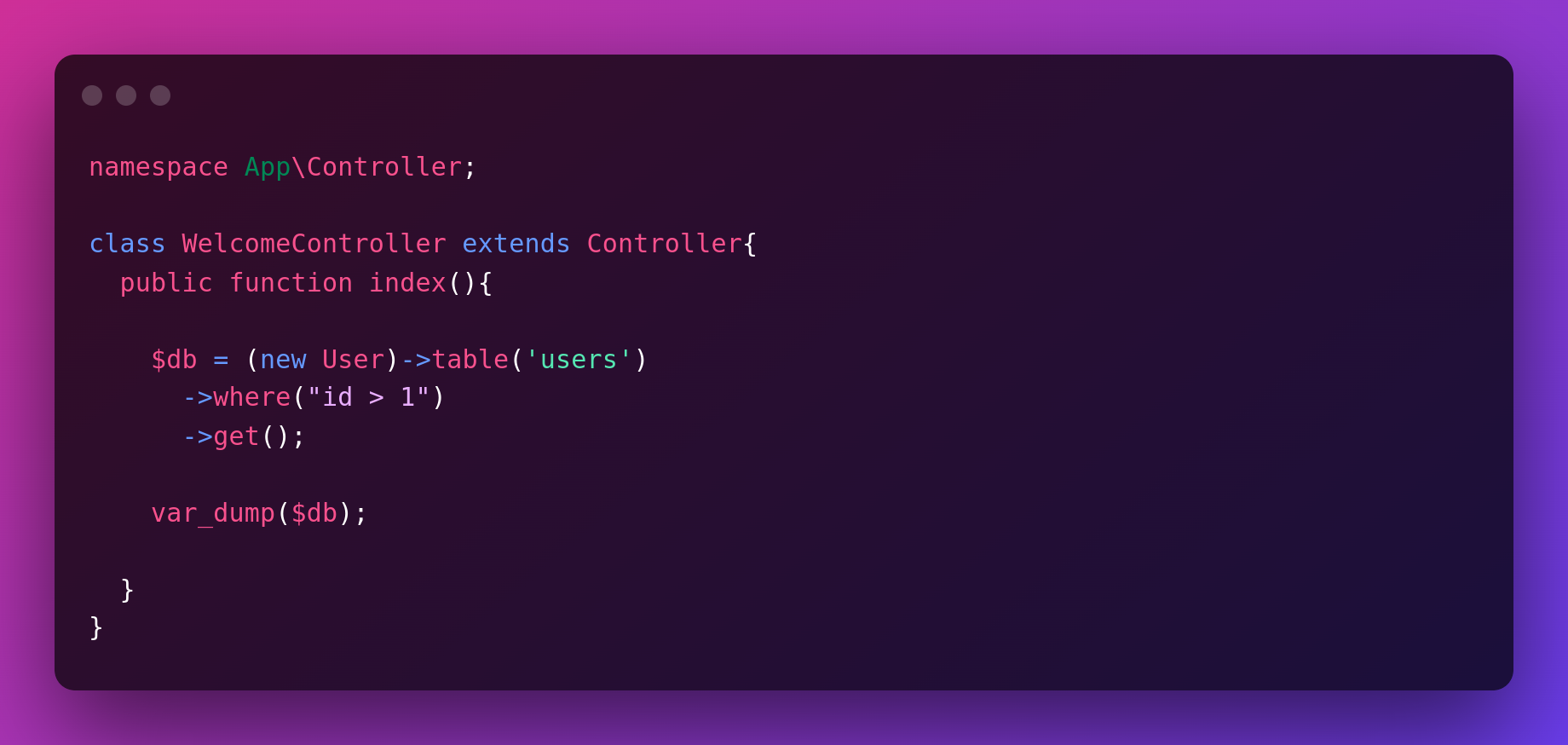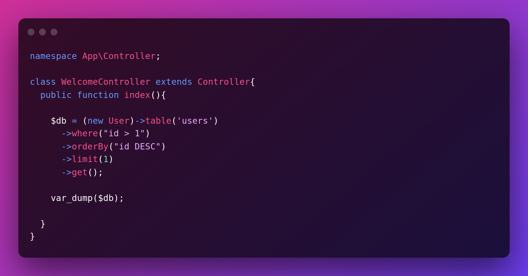 Yukarda görmüş olduğunuz işlem ORM ile yapılıyor. Bu işlem sayesinde veritabanındaki table('example') ile belirtilen tablodaki bütün veriyi getirir.