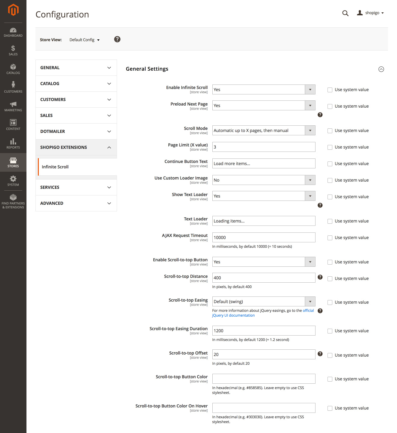 - Go to the menu "Stores > Configuration > Shopigo Extensions > Infinite Scroll"