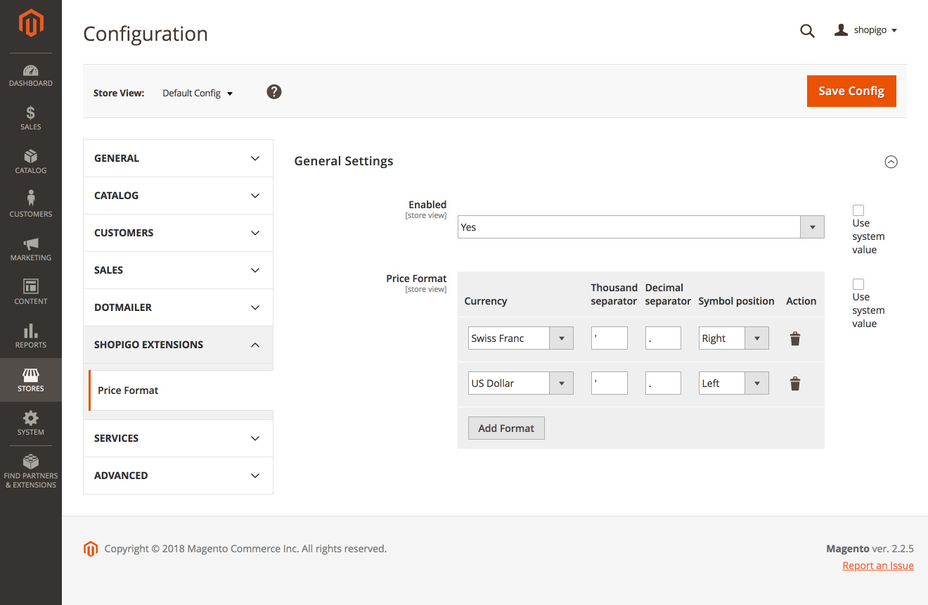 - Go to the menu "Stores > Configuration > Shopigo Extensions > Price Format"