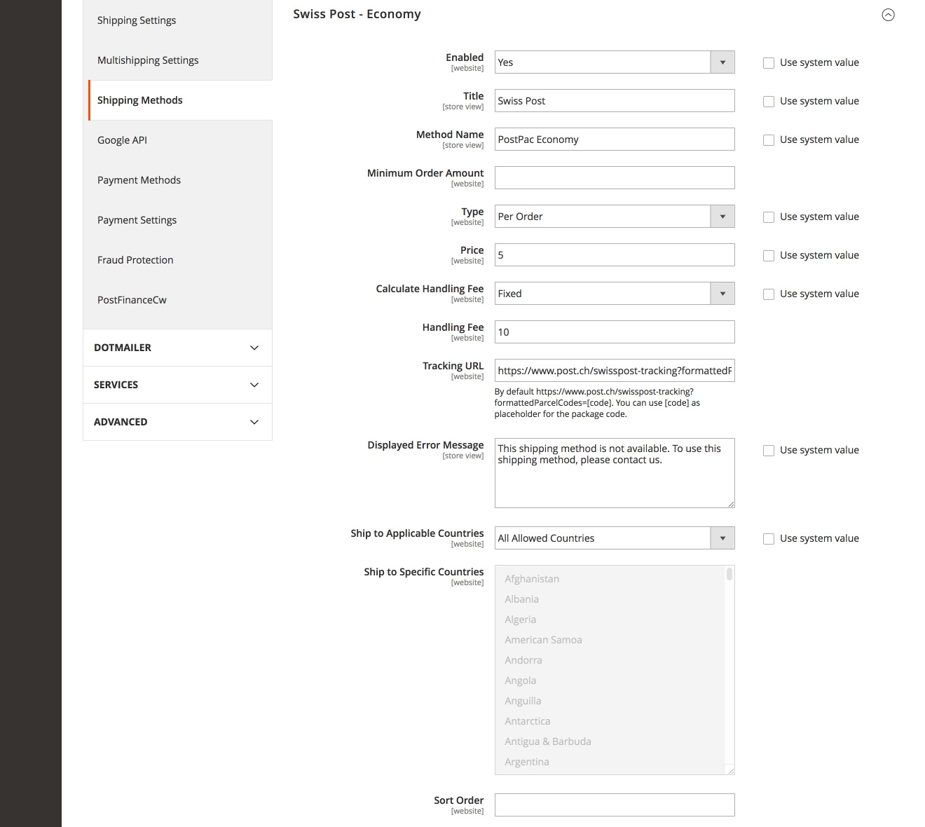 - Go to the menu "Stores > Configuration > Sales > Shipping Methods"