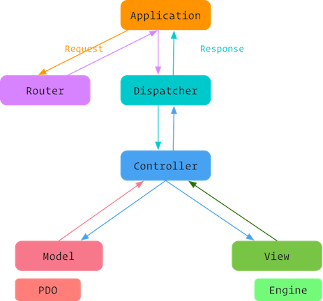 Application 将接收到的 HTTP 请求交给路由处理,并将路由结果交给控制器调度器; 控制器处理应用程序的业务逻辑,调用相应的模型和视图,并将处理结果通过调度器返给 Application 做最终的 HTTP 响应封装。