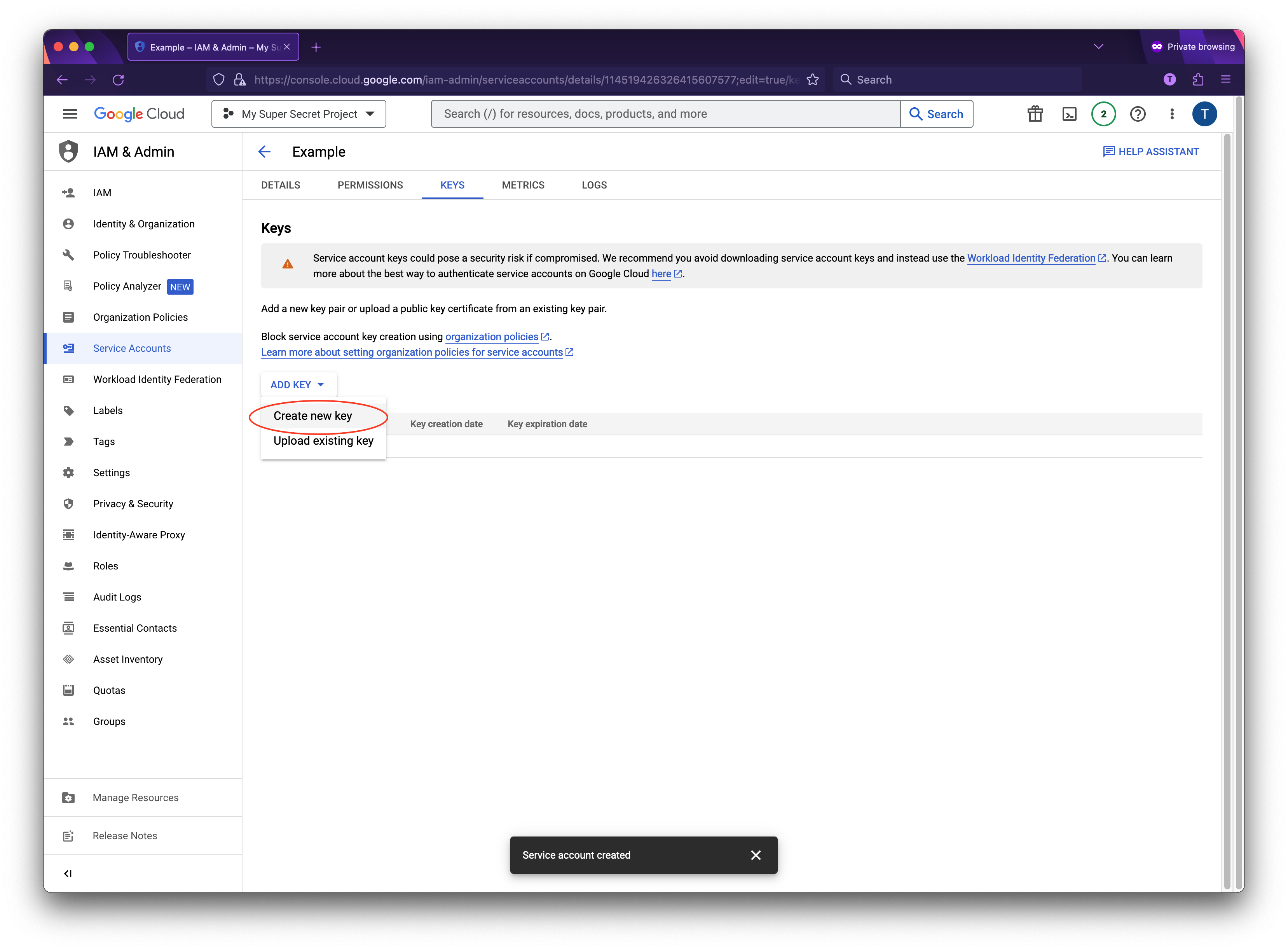 Go to the details screen of your created service account and select "keys", from the "Add key" dropdown select "Create new key".