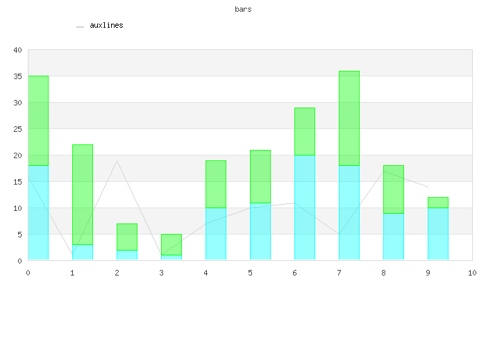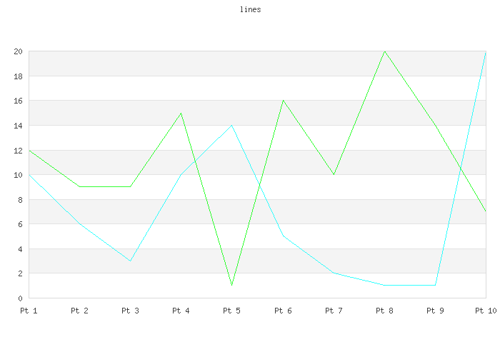 use sqonk\phext\plotlib\BulkPlot; $plot = new BulkPlot; // add a chart with two line plots. $plot->add('line', [ array_map(fn($v) => rand(1, 20), range(1, 10)), array_map(fn($v) => rand(1, 20), range(1, 10)) ], [ 'title' => 'lines', 'xseries' => range(1, 10), 'xformatter' => fn($v) => "Pt $v", ]); // add a stacked bar chart. $plot->add('barstacked', [ array_map(fn($v) => rand(1, 20), range(1, 10)), array_map(fn($v) => rand(1, 20), range(1, 10)) ], [ 'title' => 'bars', 'auxlines' => [ ['values' => array_map(fn($v) => rand(1, 20), range(1, 10)), 'legend' => 'auxlines'] ] ]); $l1 = [19,3,2,7,9,18,4,15,12,13]; $l2 = [17,20,19,17,19,5,13,8,15,8]; // A graph with horizontal and vertical rules. $plot->add('line', [$l1, $l2], [ 'title' => 'Infinite Lines', 'xseries' => range(1, 10), 'font' => [FF_FONT1, FS_NORMAL, 8], 'lines' => [ ['direction' => 'h', 'value' => 7, 'color' => 'red'], ['direction' => 'v', 'value' => 4, 'color' => 'blue'] ] ]); // Finally, a plot with highlighted regions. $plot->add('line', [$l1], [ 'title' => 'Regions', 'xseries' => range(1, 10), 'font' => [FF_FONT1, FS_NORMAL, 8], 'regions' => [ ['x' => 3, 'y' => 20, 'x2' => 7, 'y2' => 15, 'color' => 'red@0.3'], ['x' => 6, 'y' => 2, 'x2' => 10, 'y2' => 0, 'color' => 'red@0.3'] ] ]); // output all charts to a subfolder called 'plotlibtests'. // this will output two files called 'lines.png' and 'bars.png'. $plot->output_path('plotlibtests')->render();