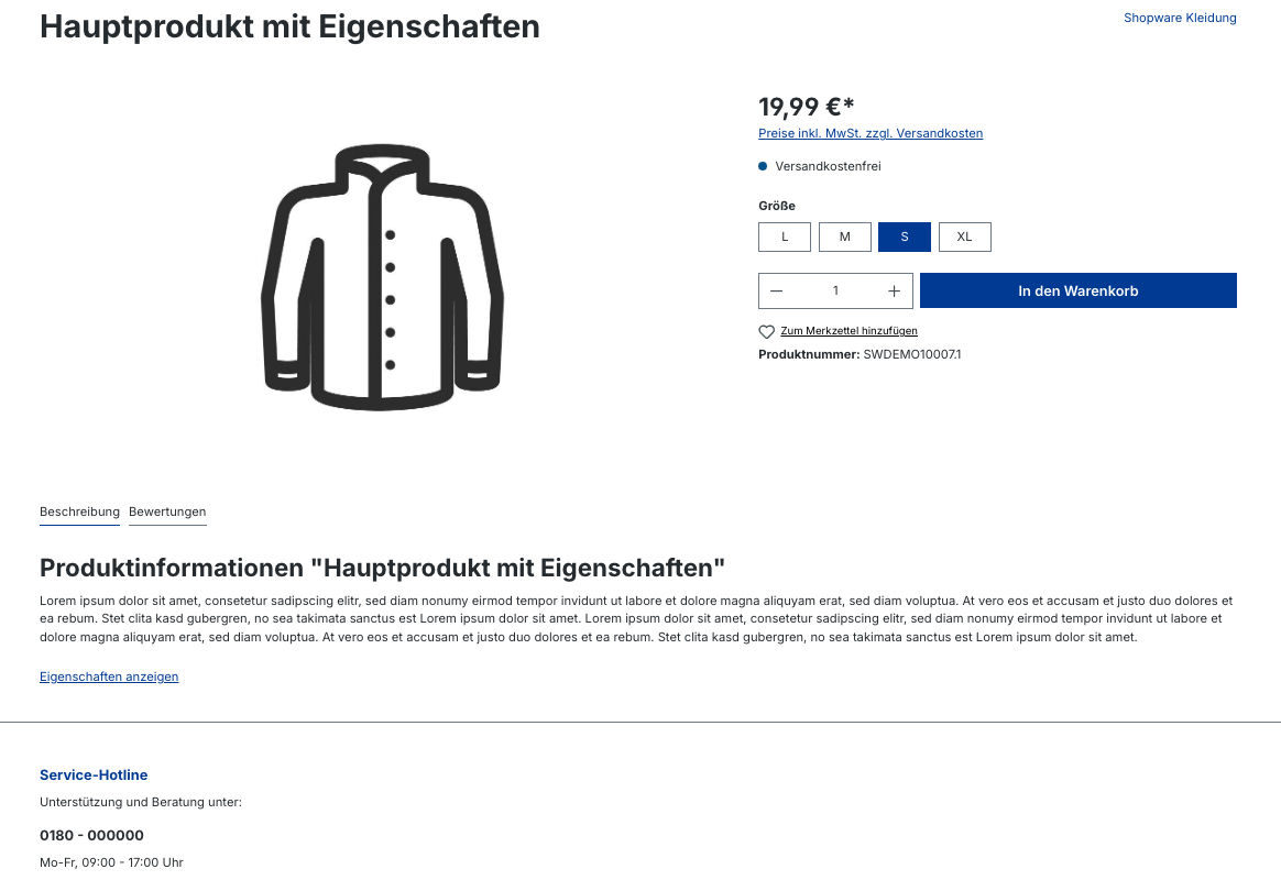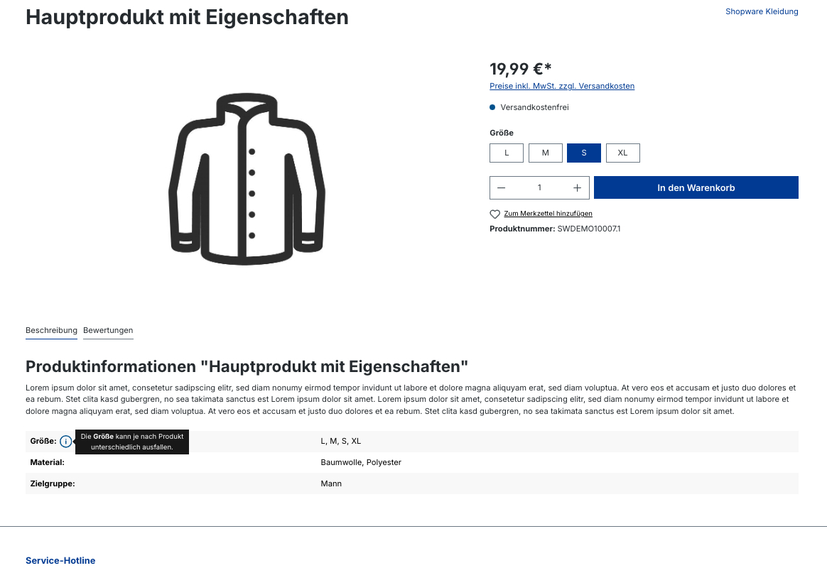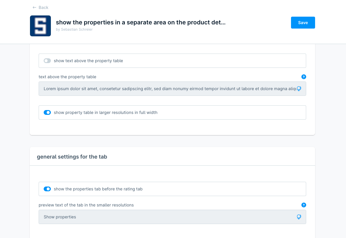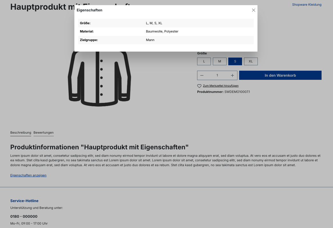 An extension to show the properties in a separate area on the product detail page. The separate area can either be a separate tab or a modal box that can be reached via a link. The tab can be shown before or after the rating tab. The link to open the modal can be placed either above the buy button, above the product number or below the description text in the description tab. Furthermore, you can show a headline and a text above the property table if required. In addition, tooltips can also be shown to describe the properties.