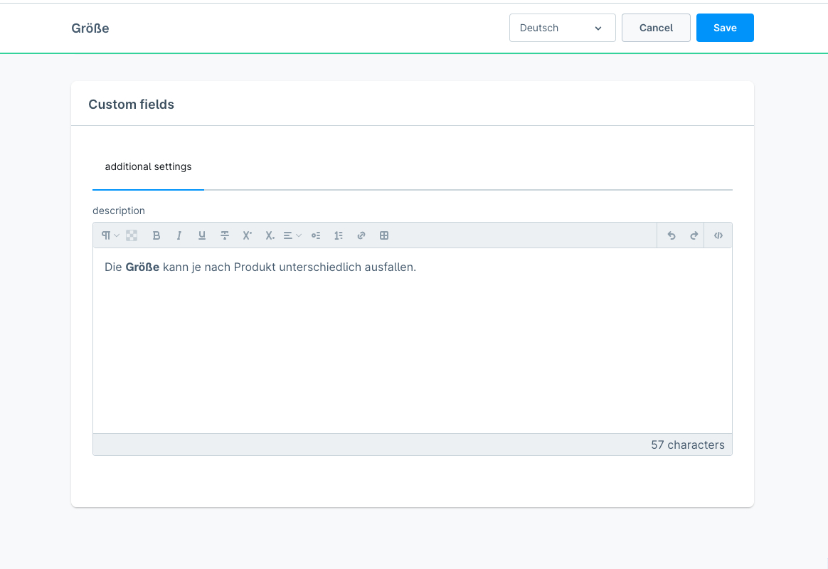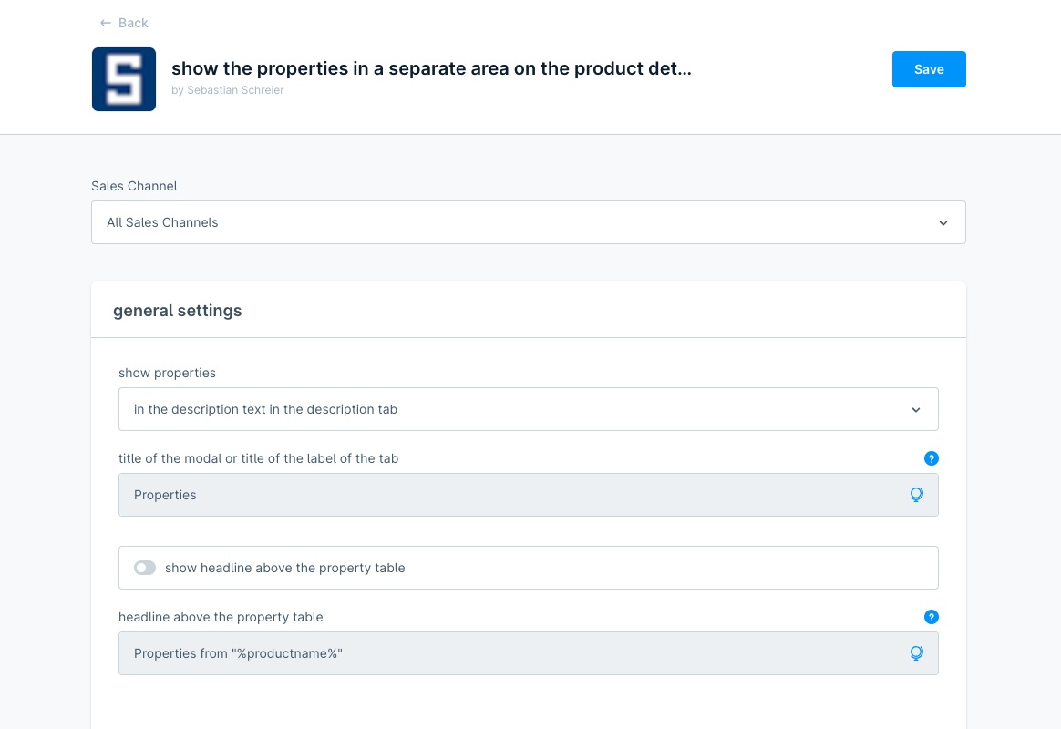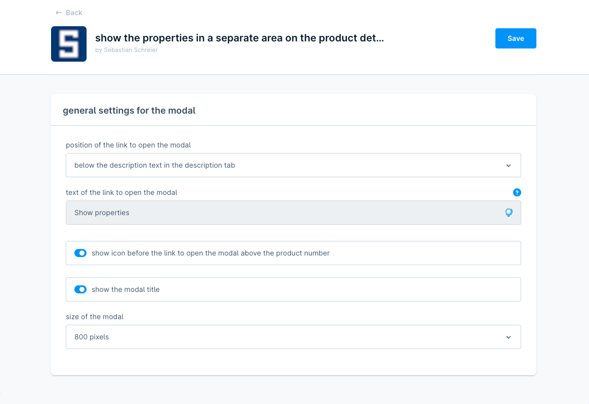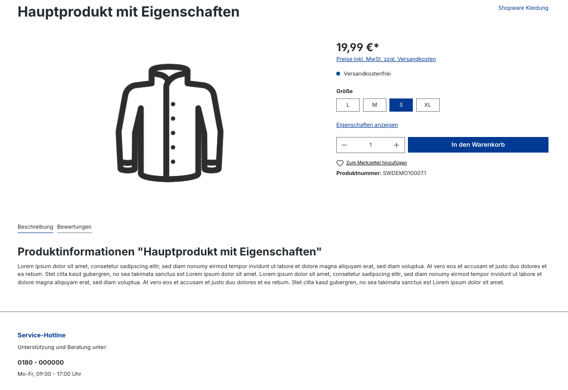 An extension to show the properties in a separate area on the product detail page. The separate area can either be a separate tab or a modal box that can be reached via a link. The tab can be shown before or after the rating tab. The link to open the modal can be placed either above the buy button, above the product number or below the description text in the description tab. Furthermore, you can show a headline and a text above the property table if required. In addition, tooltips can also be shown to describe the properties.