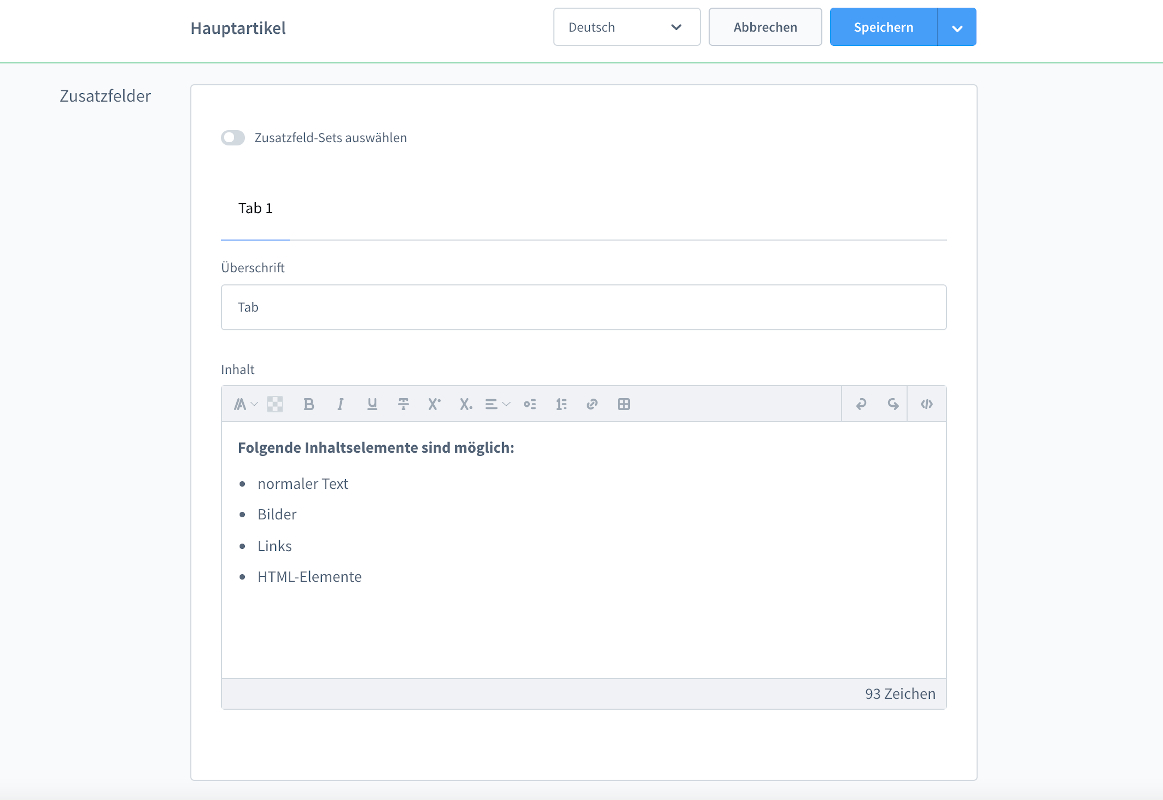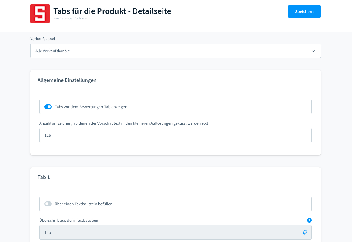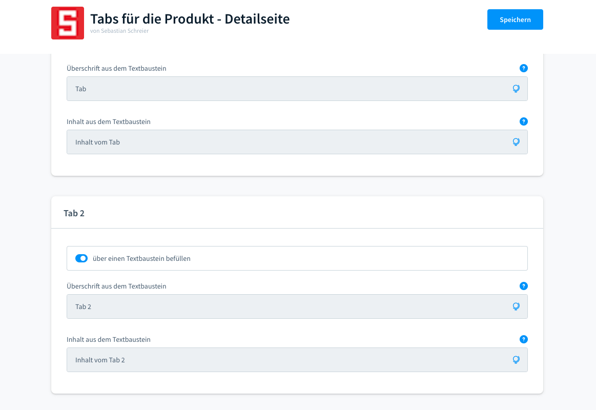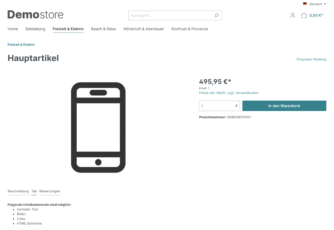 A extension for tabs for the product detail page, which can be displayed before or after the reviews tab. The content of the tabs comes either from the rich text editor at the product or from a snippet. The tabs are also displayed when assigning a product page layout. When you increase the value from the constant NUMBER_TABS in the file SschreierTabProductDetailPage.php in the src-directory before the installation, you can add so much tabs as you like.