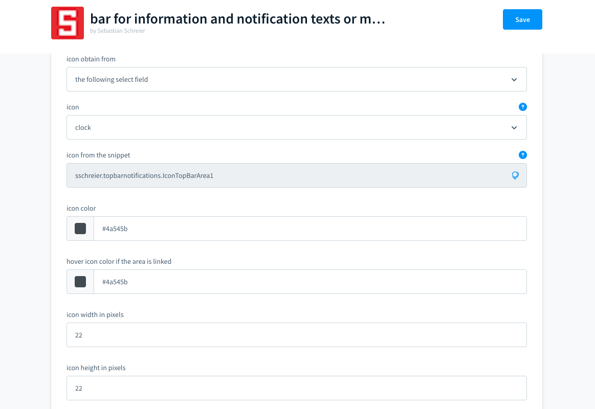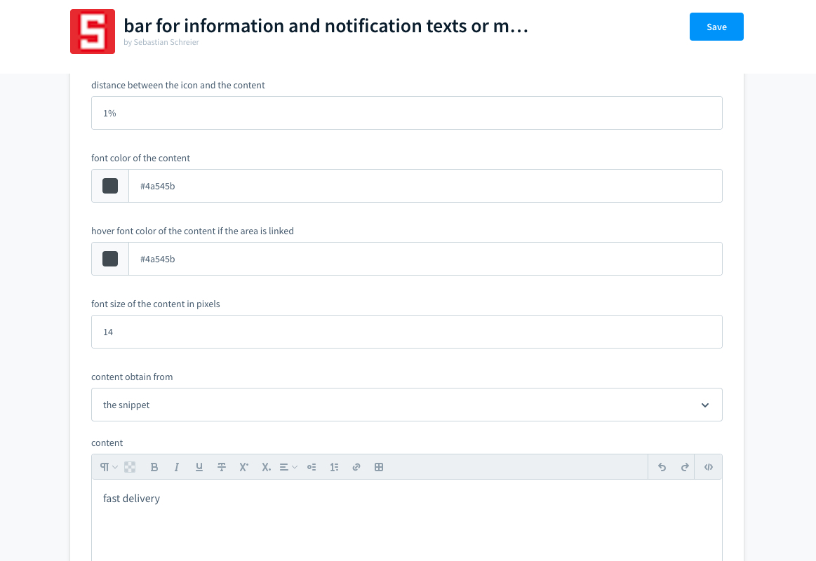 An extension for a bar for information and notification texts or messages which can contain up to 4 areas. It can be displayed either in the top bar or in the footer bar or also above or below the breadcrumb navigation.