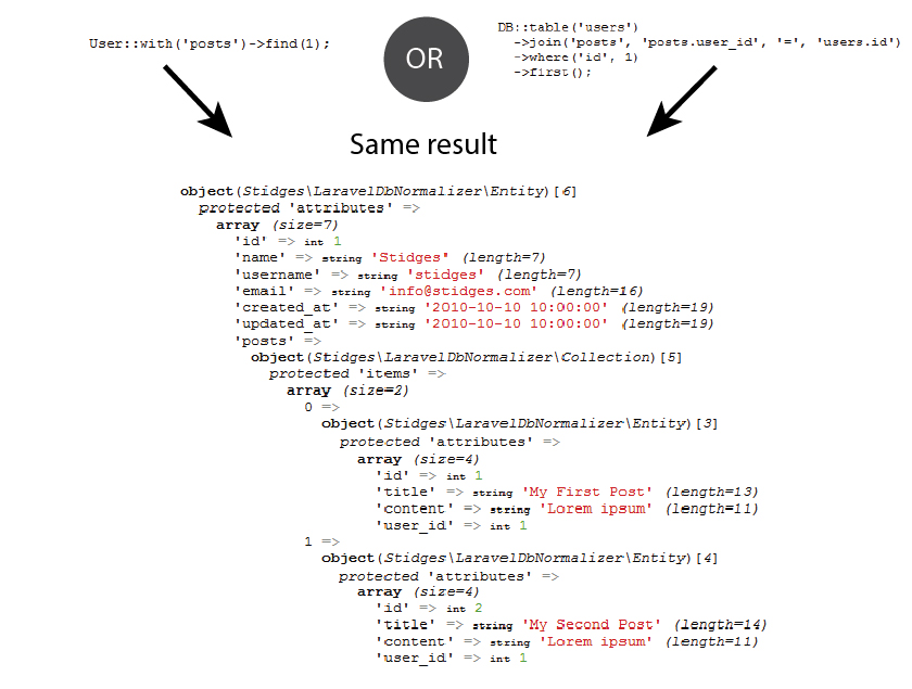 use Stidges\LaravelDbNormalizer\Normalizer; //... // Example using the query builder $result = DB::table('users')->get(); // ... Do stuff with the result. $normalized = with(new Normalizer)->normalize($result); // Example using Eloquent $user = User::find(1); // ... Do stuff with the user. $normalized = with(new Normalizer)->normalize($user->toArray()); // Example using Eloquent collection $users = User::all(); // ... Do stuff with the users. $normalized = with(new Normalizer)->normalize($users->toArray());
