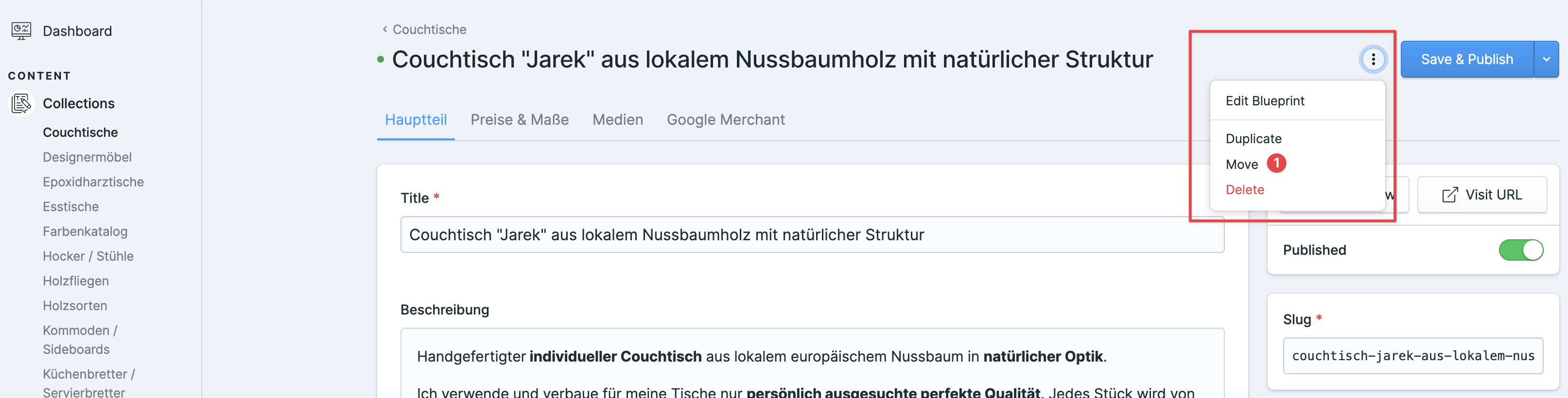 - Move one or multiple entries from one collection to another: available in list view and detail view