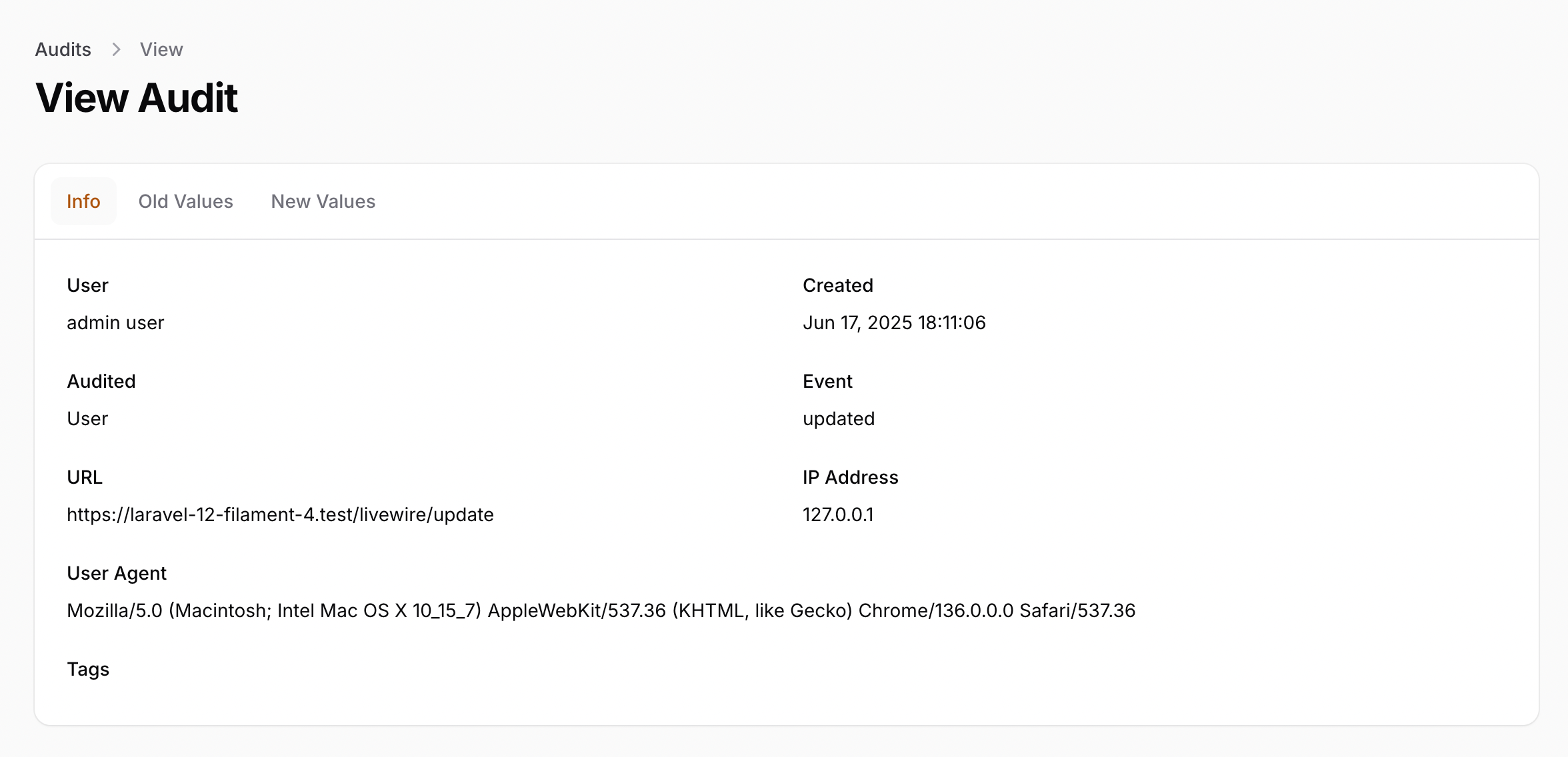 If you access your resource, and edit some data, you will now see the audits table on edit and view pages.
