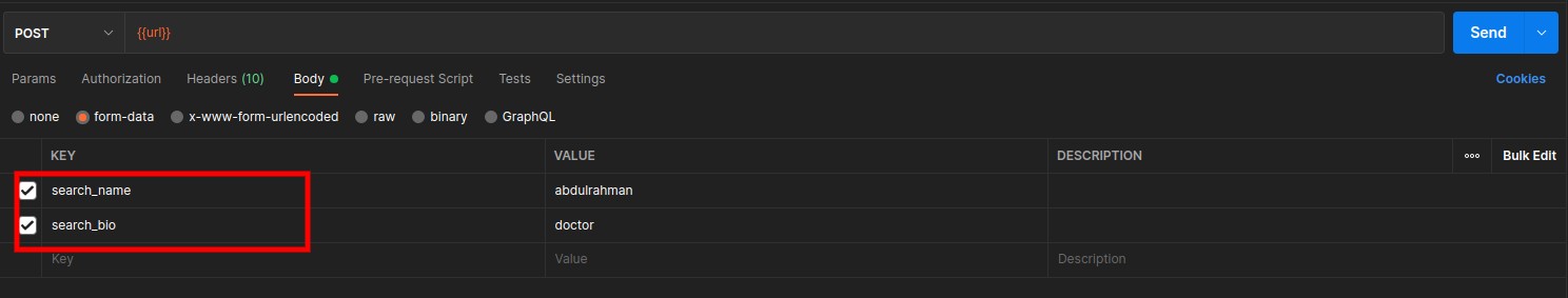 and you should pass a one array parameter column you need to search or fillter in array key and the request key thet come from your request as a value of key like:['name'=>'search_name','bio'=>'search_bio']