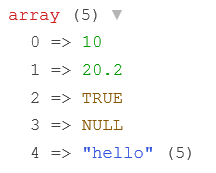 $arr = array(10, 20.2, true, null, 'hello'); dump($arr); // or Tracy\Debugger::dump($arr);