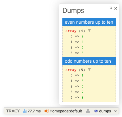 . This allows us to dump variables in Debugger Bar. This is useful, because dumps don't mess up the output and we can also add a title to the dump.