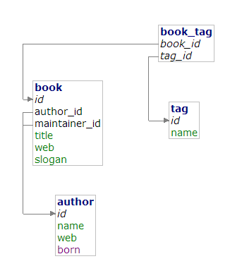 $books = new BookRepository($connection); // $connection instanceof Nette\Database\Context foreach ($books->findAll() as $book) { // $book instanceof Book echo $book->title; echo $book->getAuthor()->name; foreach ($book->getTags() as $tag) { // $tag instanceof Tag echo $tag->name; } }