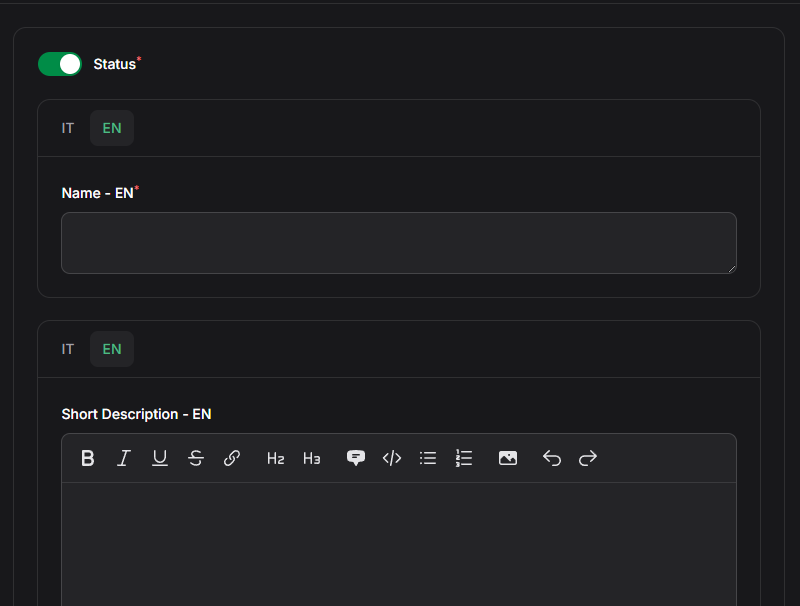 On the main model you have to define the fields that will be translatable using standard Filament fields as you would do in a resource, specify them in method setTranslatableFilamentFields(), the make() method has to contain the field names that are present in the database on the Language table