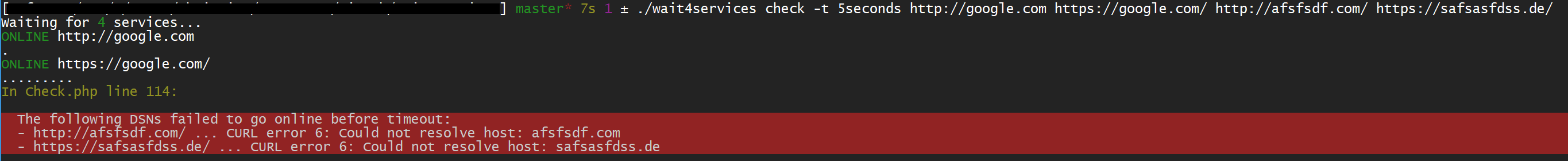 # start docker services docker-compose up -d # wait for the services vendor/bin/wait4services \ "pdo-mysql://dbuser:dbpass@docker/somedb" \ "http://docker/wp-admin" # run your tests vendor/bin/phpunit