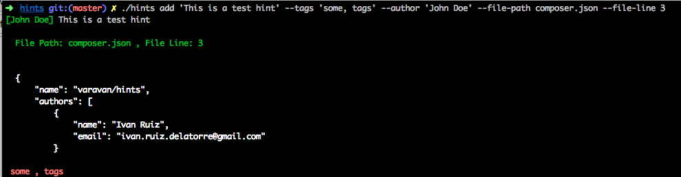 For example hints show --author 'Jhon Doe' --tags 'set-up,init' --limit 15