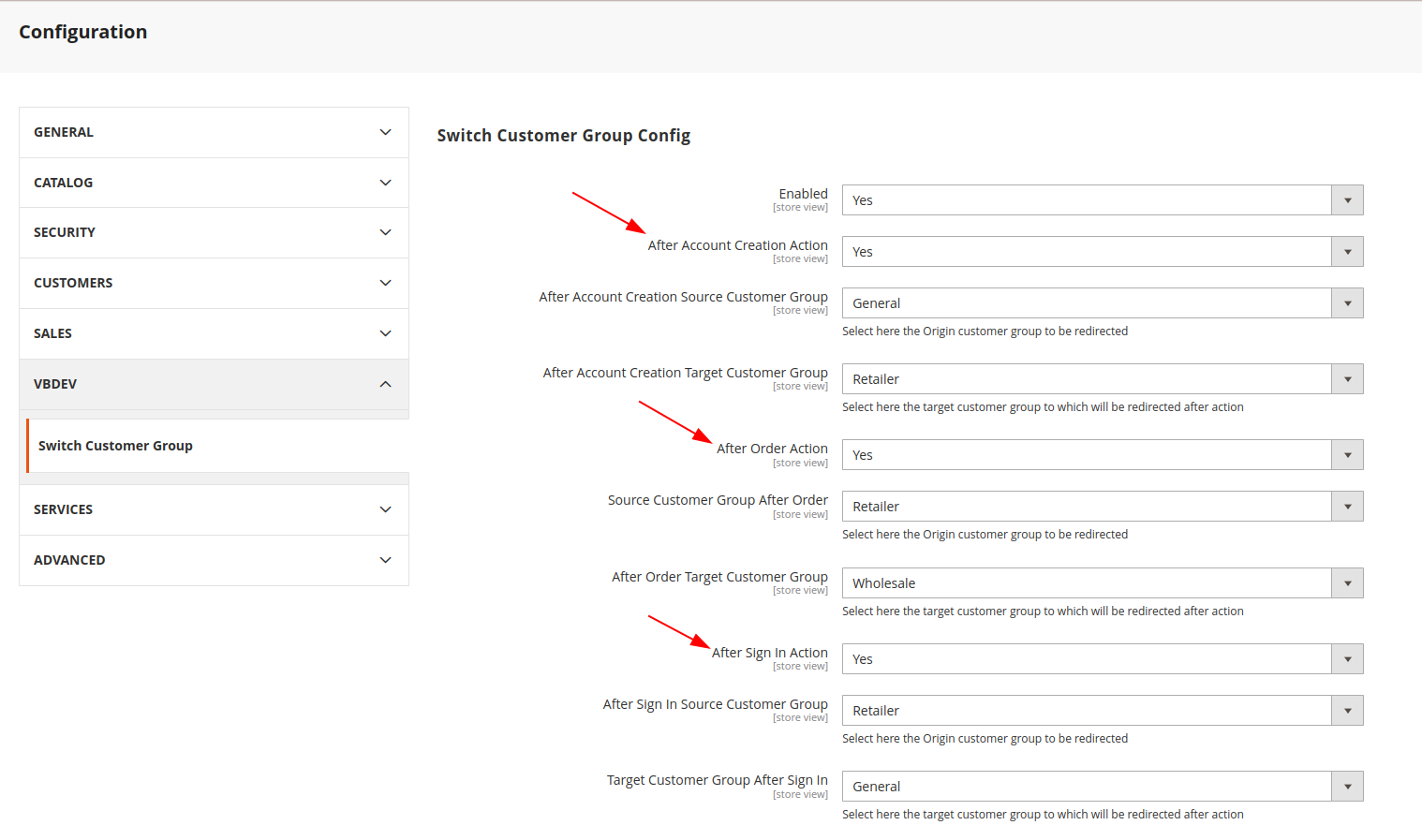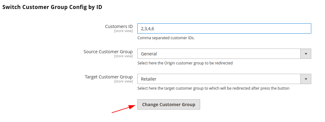 - The module offers a configuration in the admin, in Stores->Configuration->VBDEV->Switch Customer Group