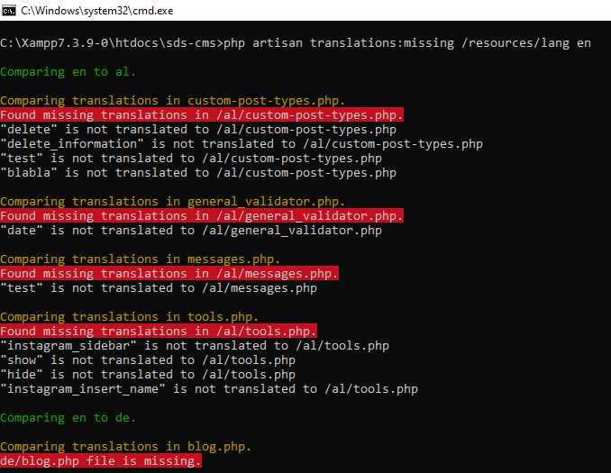 $ php artisan translations:missing /resources/lang en