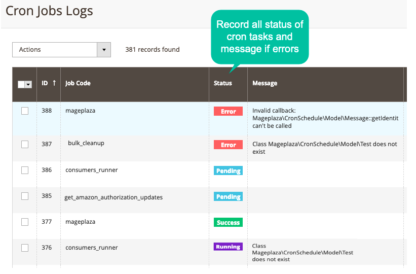 A: You can view all states of any cron tasks. You will be well-notified when a cron task gets Error, Missed, Pending, Running, Success. If the process has the problems, the log will display a message containing all error details, and you can identify and resolve to make it run properly.