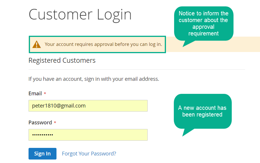 In case the approval is automatic, customers will be approved immediately when finishing account registration and can log in easily. By contrast, if store owners would like to control carefully visitors, the approval can be managed manually from store backend.