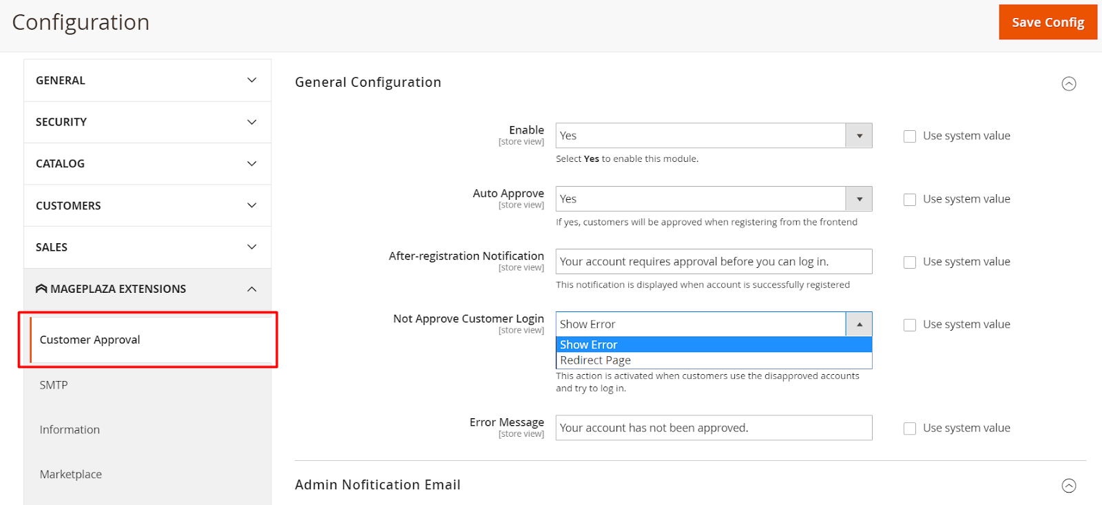 Login to the Admin Magento, choose Stores> Configuration> Customer Approval