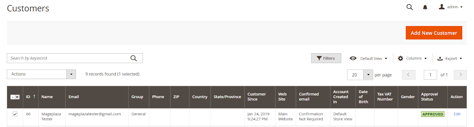 . - This section lists the information of the registered customer with fields such as Name, Email, Group, Approval Status, Date of Birth, etc. Here you can manually approve or not approve at Action and edit with any customer you want.