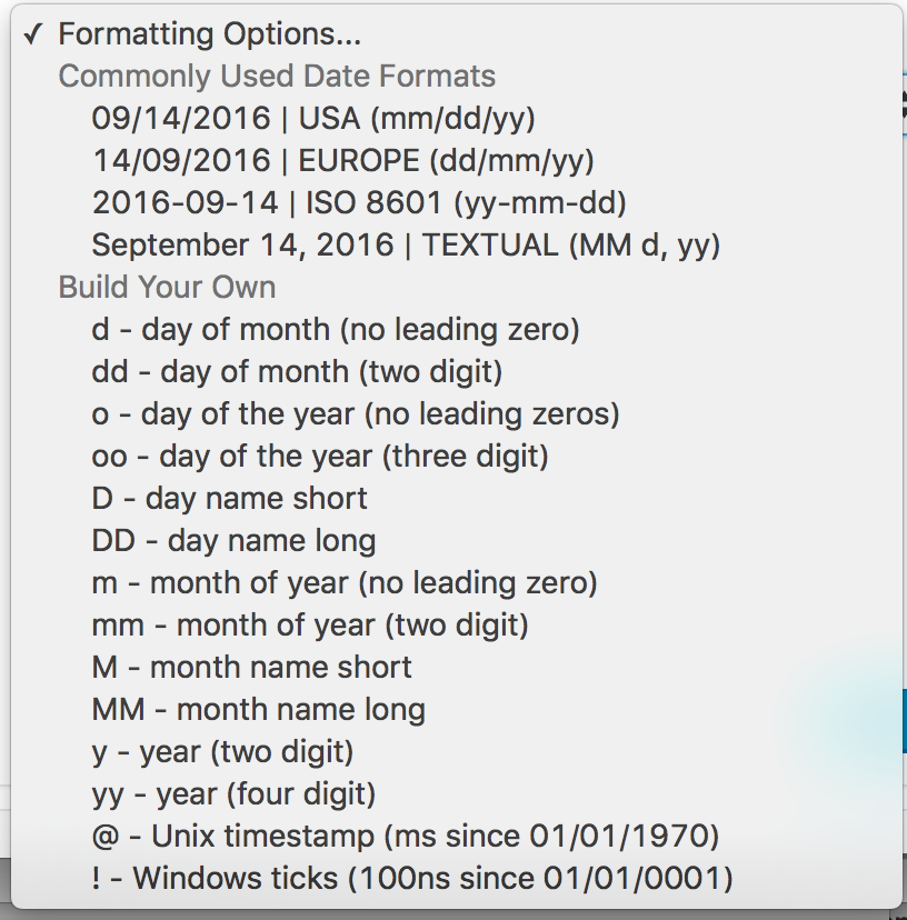 You are presented first with a dropdown menu titled Formatting Options.... The quickest way to get up and running is to select a Commonly Used Date Format section inside this dropdown list. This will populate the date formatter text field below it with letters which tell the Date Field how the date should appear.