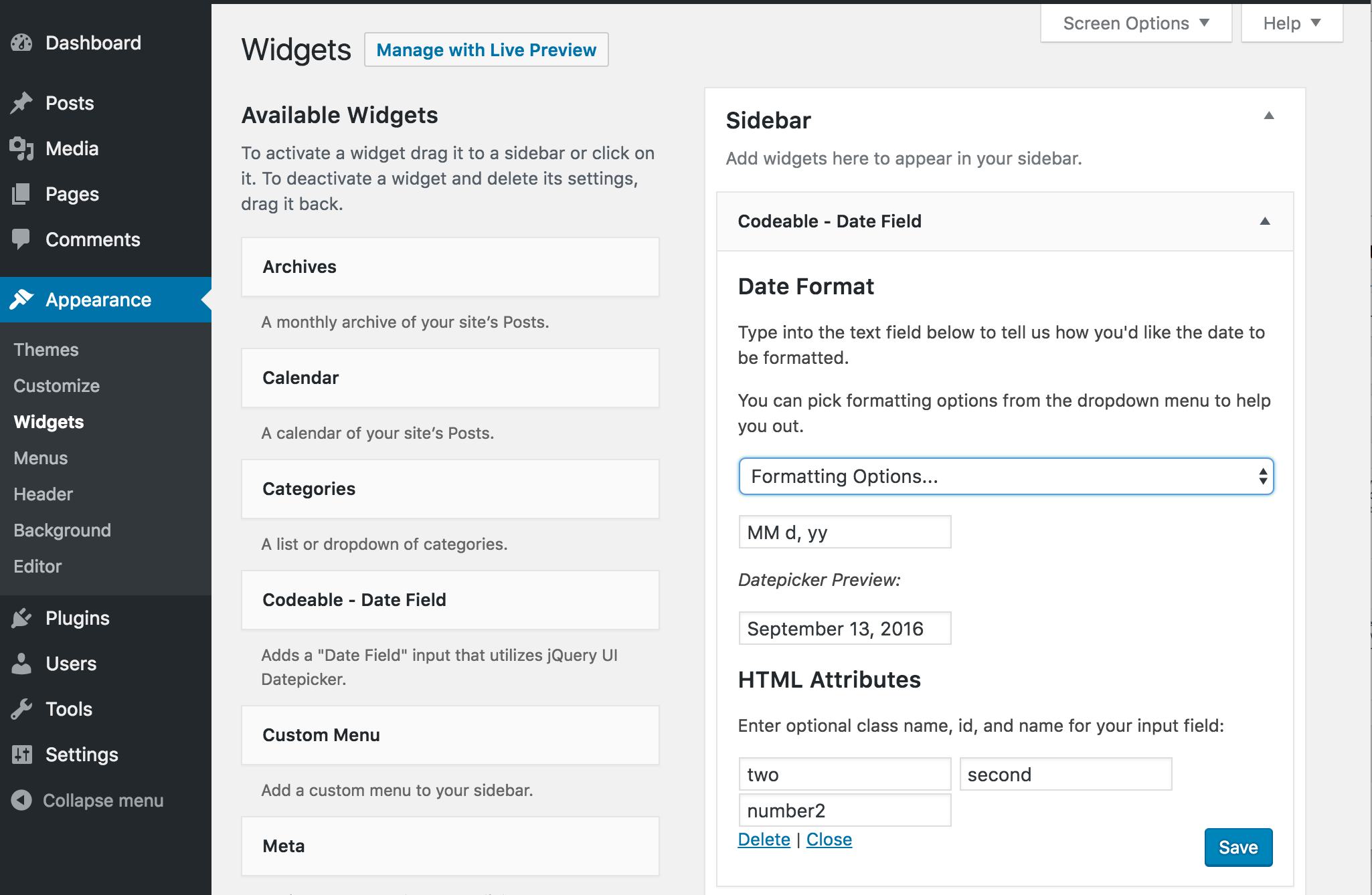 Once activated, visit Appearance -> Widgets and you will see a Codeable - Date Field widget that you can drag into your various Sidebar and Footer areas. Once added, you'll see a screen with all of the widget options.