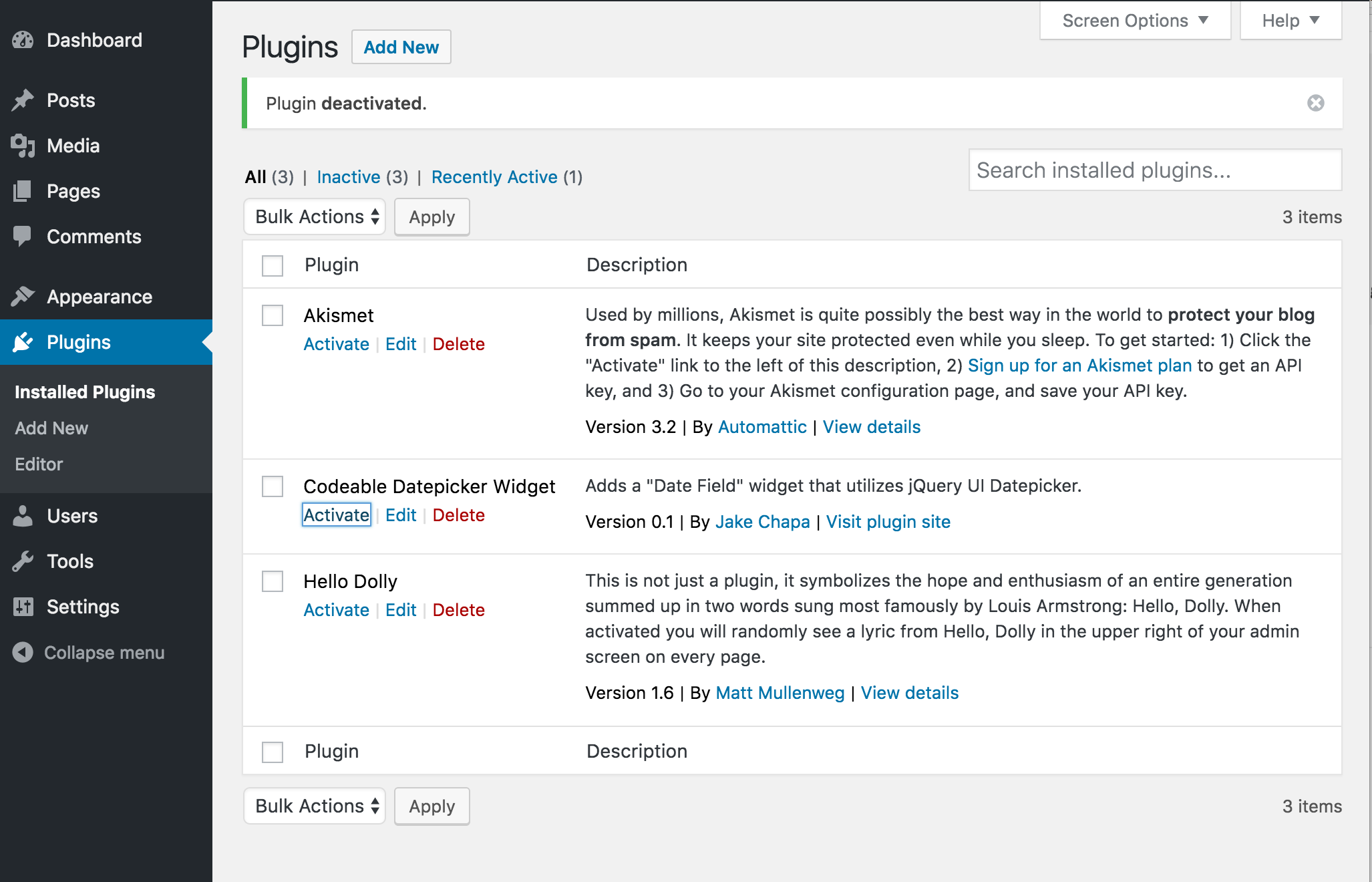 Copy the plugin into your wp-content/plugins/ directory, and then login to your WP Admin, go to Plugins , find Codeable Date Field and click Activate