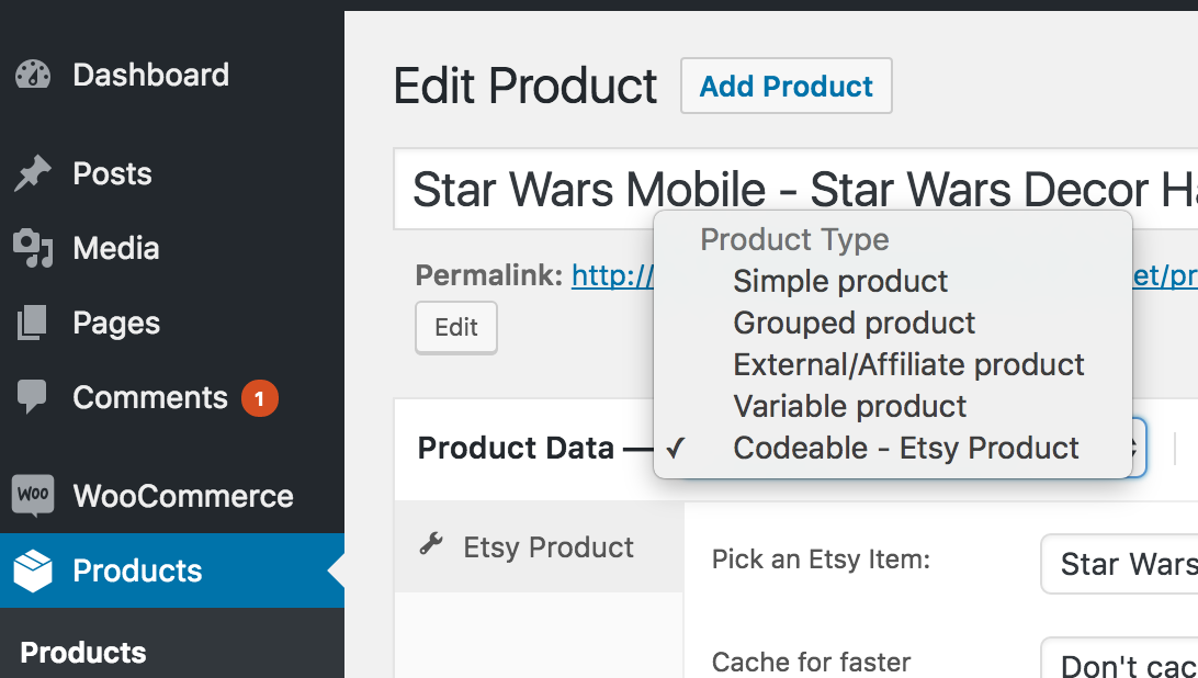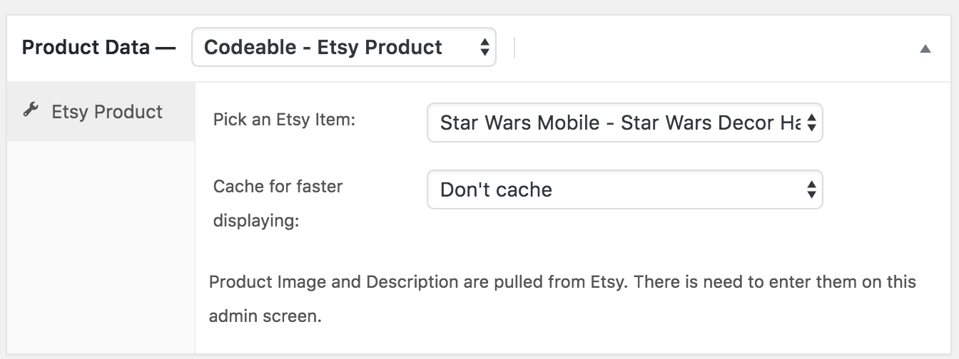 - New Product Type: Adds "Etsy Product" to WooCommerce's product type selector