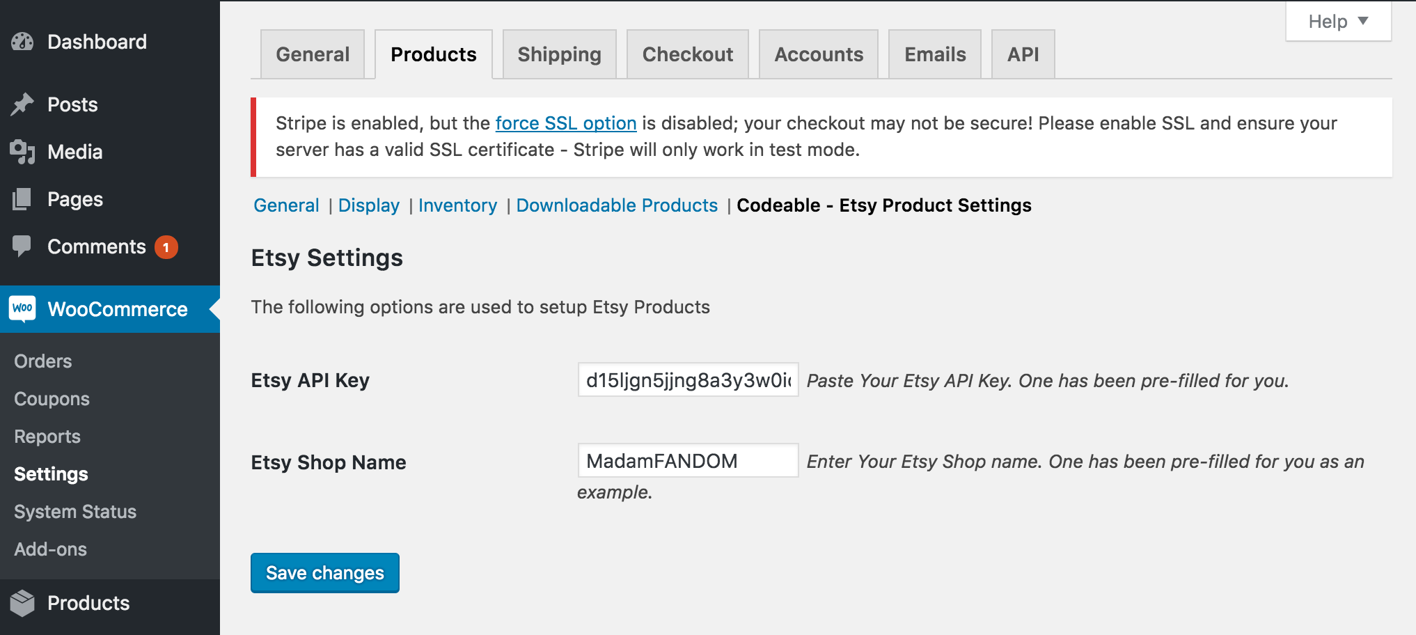 Currently, the plugin supports one Etsy shop per WordPress installation. All Etsy products pull from the configured shop.