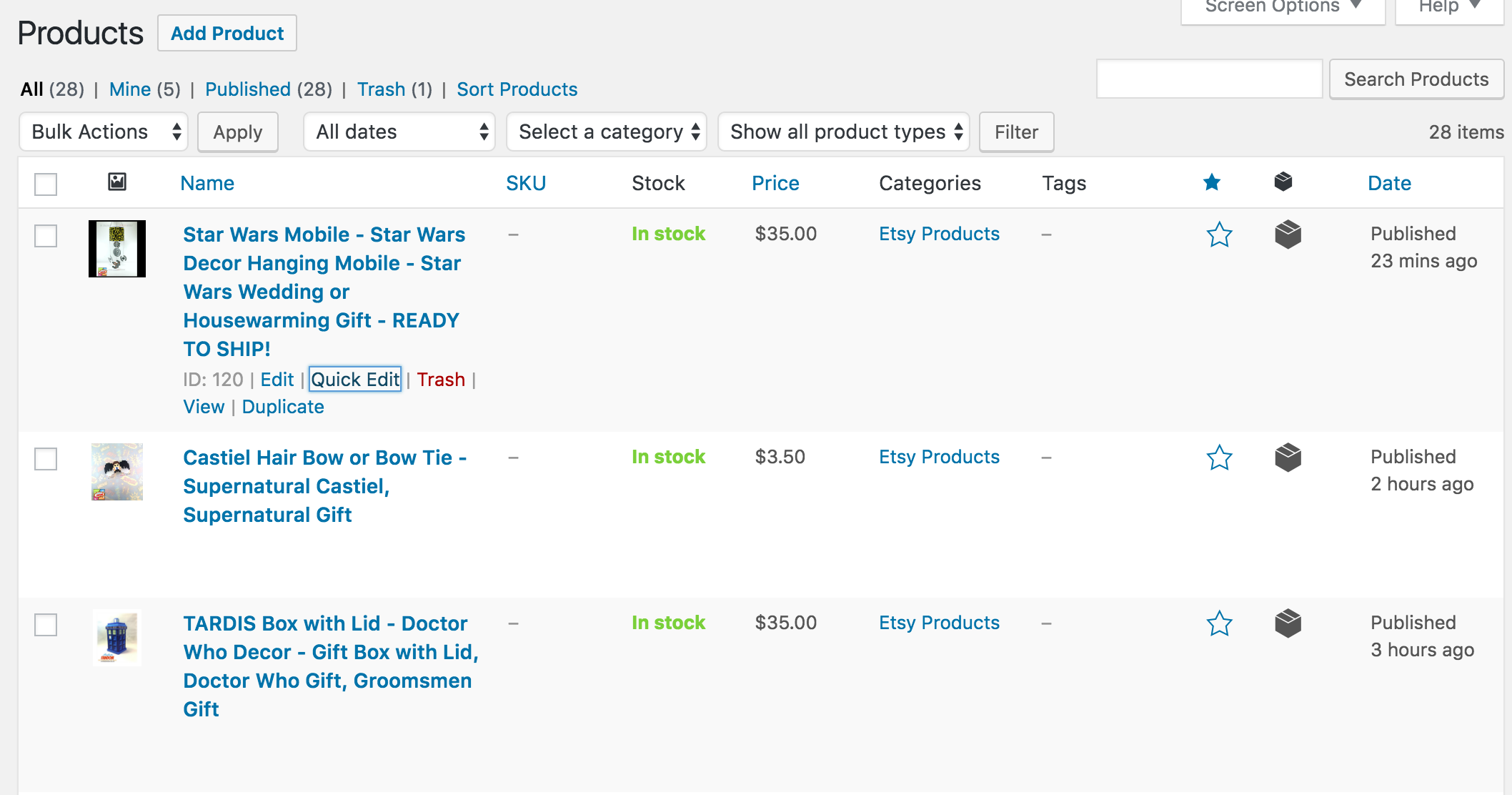 Your Etsy products will appear in your admin list view with the title, price, and picture: