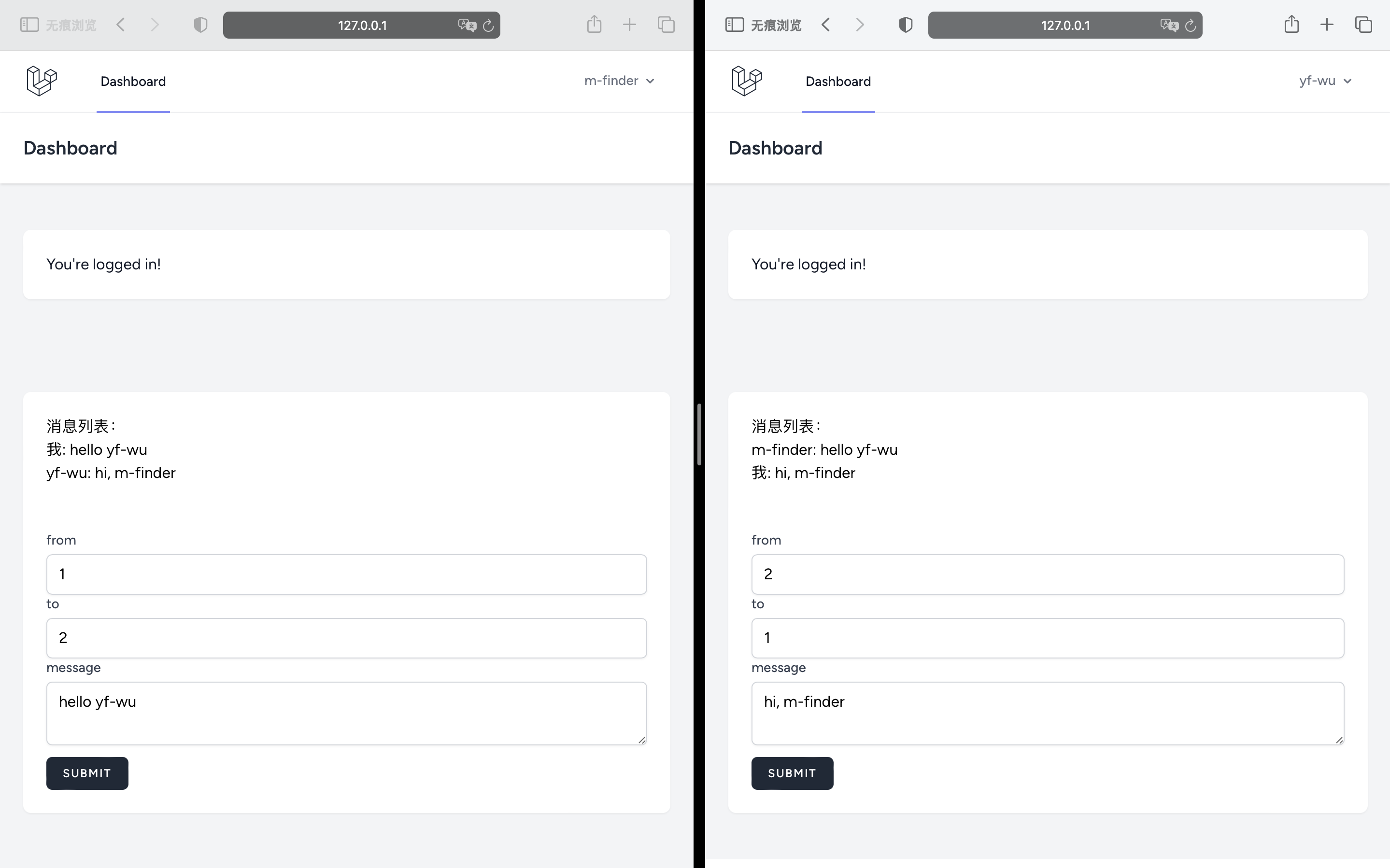 laravel/breezepackage and working with Blade templates, you can paste the following code intodashboard.blade.phpfor a quick test.@auth <div class="py-12"> <div class="max-w-7xl mx-auto sm:px-6 lg:px-8"> <div class="bg-white dark:bg-gray-800 overflow-hidden shadow-sm sm:rounded-lg"> <div class="grid grid-cols-1 md:grid-cols-2"> <div class="p-6" id="server-message"> messages:<br/> </div> <div class="p-6"> <label class="block font-medium text-sm text-gray-700 dark:text-gray-300" for="from">from</label> <input class="border-gray-300 dark:border-gray-700 dark:bg-gray-900 dark:text-gray-300 focus:border-indigo-500 dark:focus:border-indigo-600 focus:ring-indigo-500 dark:focus:ring-indigo-600 rounded-md shadow-sm block mt-1 w-full" value="{{ auth()->user()->getKey() }}" id="from"> <label class="block font-medium text-sm text-gray-700 dark:text-gray-300" for="to">to</label> <input class="border-gray-300 dark:border-gray-700 dark:bg-gray-900 dark:text-gray-300 focus:border-indigo-500 dark:focus:border-indigo-600 focus:ring-indigo-500 dark:focus:ring-indigo-600 rounded-md shadow-sm block mt-1 w-full" value="" id="to"> <label class="block font-medium text-sm text-gray-700 dark:text-gray-300" for="message">message</label> <textarea class="border-gray-300 dark:border-gray-700 dark:bg-gray-900 dark:text-gray-300 focus:border-indigo-500 dark:focus:border-indigo-600 focus:ring-indigo-500 dark:focus:ring-indigo-600 rounded-md shadow-sm block mt-1 w-full" id="message"></textarea> <input class="inline-flex items-center px-4 py-2 bg-gray-800 dark:bg-gray-200 border border-transparent rounded-md font-semibold text-xs text-white dark:text-gray-800 uppercase tracking-widest hover:bg-gray-700 dark:hover:bg-white focus:bg-gray-700 dark:focus:bg-white active:bg-gray-900 dark:active:bg-gray-300 focus:outline-none focus:ring-2 focus:ring-indigo-500 focus:ring-offset-2 dark:focus:ring-offset-gray-800 transition ease-in-out duration-150 mt-3" type="button" id="submit" value="submit"> </div> </div> </div> </div> </div> <script type="text/javascript"> let heartBeatTimer = 0; let socket = connectWebSocket(); function startHeartbeat(interval) { interval = interval || 30; heartBeatTimer = setInterval(function () { sendMessage(null, "heart_beat"); }, interval * 1000); } function stopHeartbeat() { clearInterval(heartBeatTimer); } function connectWebSocket() { const wsServer = 'ws://127.0.0.1:9501'; const socket = new WebSocket(wsServer); let userId = document.getElementById('from').value; socket.onopen = function (evt) { let data = { user_id: userId, type: 'connect' }; console.log('open', data) socket.send(JSON.stringify(data)); }; socket.onmessage = function (evt) { console.log('get message from server: ' + evt.data); if (evt.data !== 'heart_beat') { let data = JSON.parse(evt.data); let message = document.getElementById("server-message") message.innerHTML += data.user_name + ': ' + data.data + '<br/>' } }; socket.onerror = function (evt) { console.log(evt); }; socket.onclose = function () { let data = { user_id: userId, type: 'close' }; socket.send(JSON.stringify(data)); }; return socket; } function sendMessage(to, message) { if (socket != null && socket.readyState === WebSocket.OPEN) { if (message !== 'heart_beat') { let messageBox = document.getElementById("server-message") messageBox.innerHTML += 'me: ' + message + '<br/>' } let from = document.getElementById("from") socket.send(JSON.stringify({ user_id: from.value, user_name: '{{ auth()->user()->name }}', to: to, type: 'message', data: message, })); console.log("webSocket send message:" + JSON.stringify({ user_id: from.value, user_name: '{{ auth()->user()->name }}', to: to, type: 'message', data: message, })); } else { console.log("webSocket closed"); } } let button = document.getElementById("submit"); button.addEventListener('click', function () { let message = document.getElementById("message"); let to = document.getElementById("to"); sendMessage(to.value, message.value) }); </script> @endauth