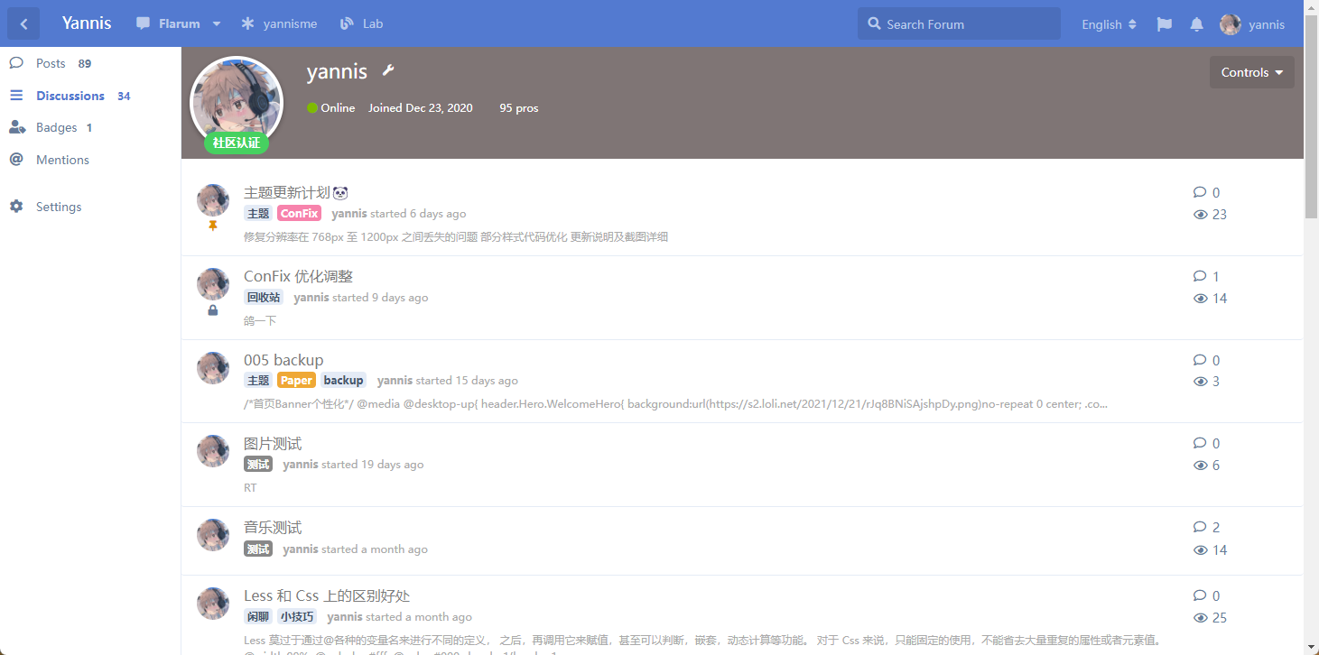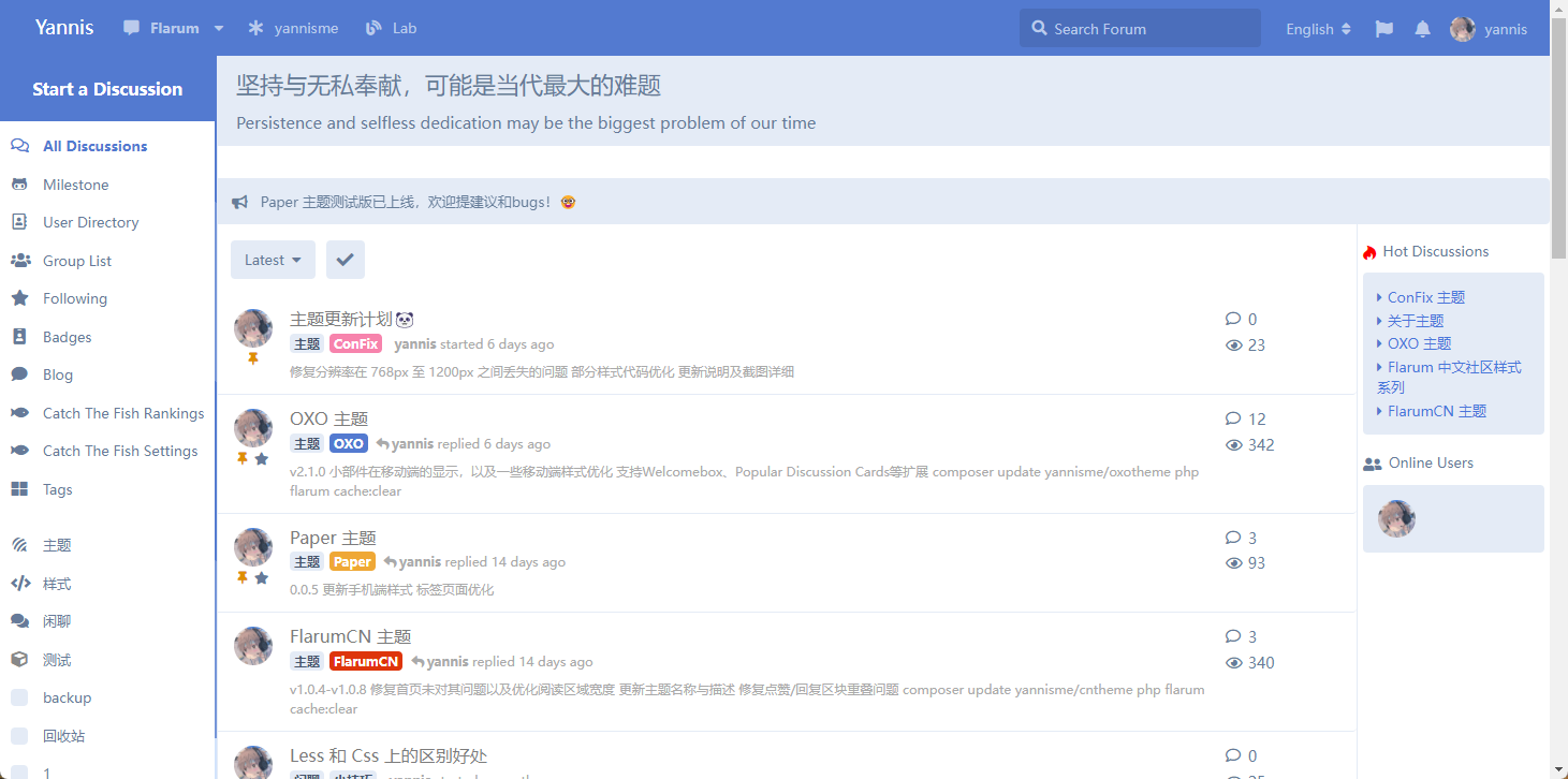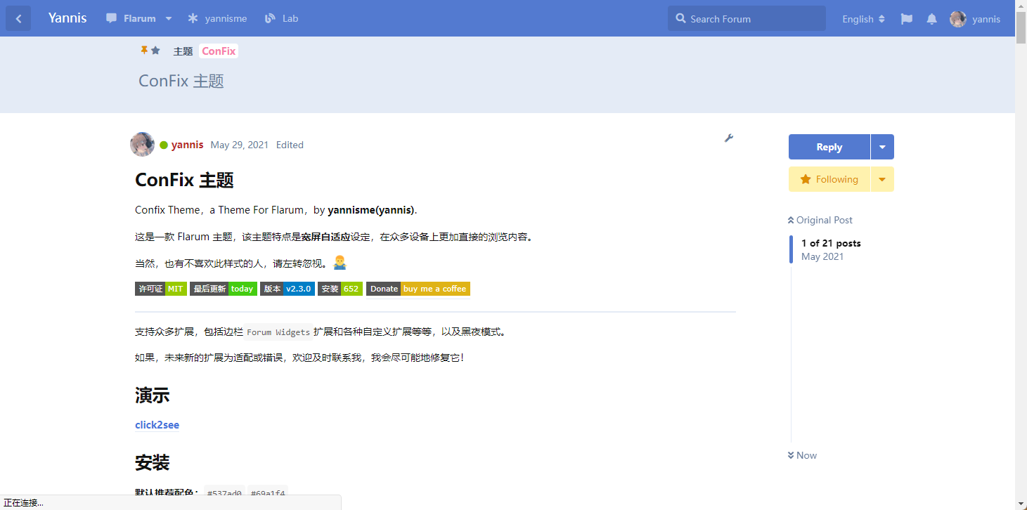 A Flarum Theme. Confix theme This is the first theme I have ever wrapped in Composer , it is so great! The theme features a widescreen setting, which is more direct to browse. Compatible with Night Mode. The mobile phone style will gradually improve~