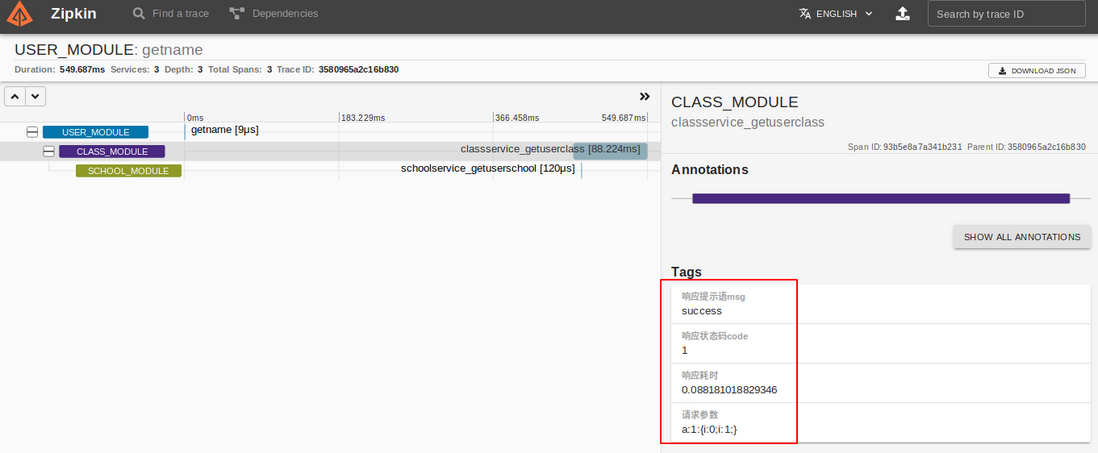 class UserService extends LogicService { public function getUserSchoolName() { $userID = 123; $module = 'School_Module'; //请求目标模块名称,需要和服务端定义的一致 $client = Client::create($module, '127.0.0.1', 9501); return $client->send(Request::create('SchoolService_getUserSchool', [$userID], $this->getTracerContext(__FUNCTION__))); //getTracerContext()用于提供追踪上下文 } } $users = UserService::factory() ->setModule('User_Module') //当前模块,用于调用链的起点 ->setTracerUrl('http://127.0.0.1:9411/api/v2/spans') //zipkin链路追踪地址 ->getUserSchoolName();