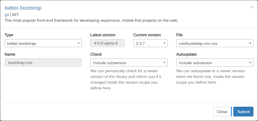 Front-end of the manager lets you add, edit, update and test assets, fetching them directly from CDNjs. You can also set up a scheduler to automatically check for (and even update to) new version of the asset, according to version mask you define.